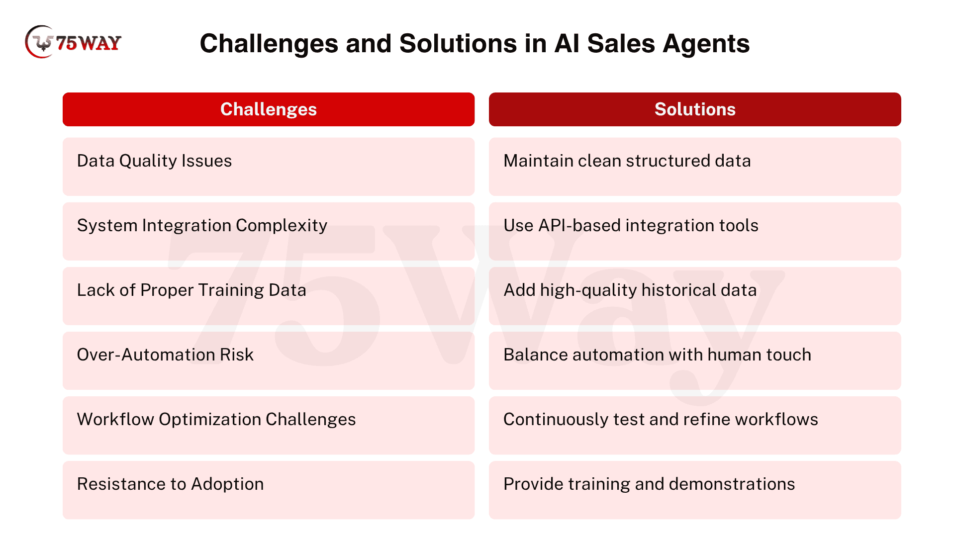 No doubt, AI sales agents improve sales efficiency, but businesses often face operational, technical, and adoption-related challenges during setup and execution. These challenges usually emerge from data inconsistencies, integration issues, workflow gaps, and team resistance. Each challenge directly impacts performance, so addressing them with structured solutions ensures smoother operations, better accuracy, and improved sales outcomes.