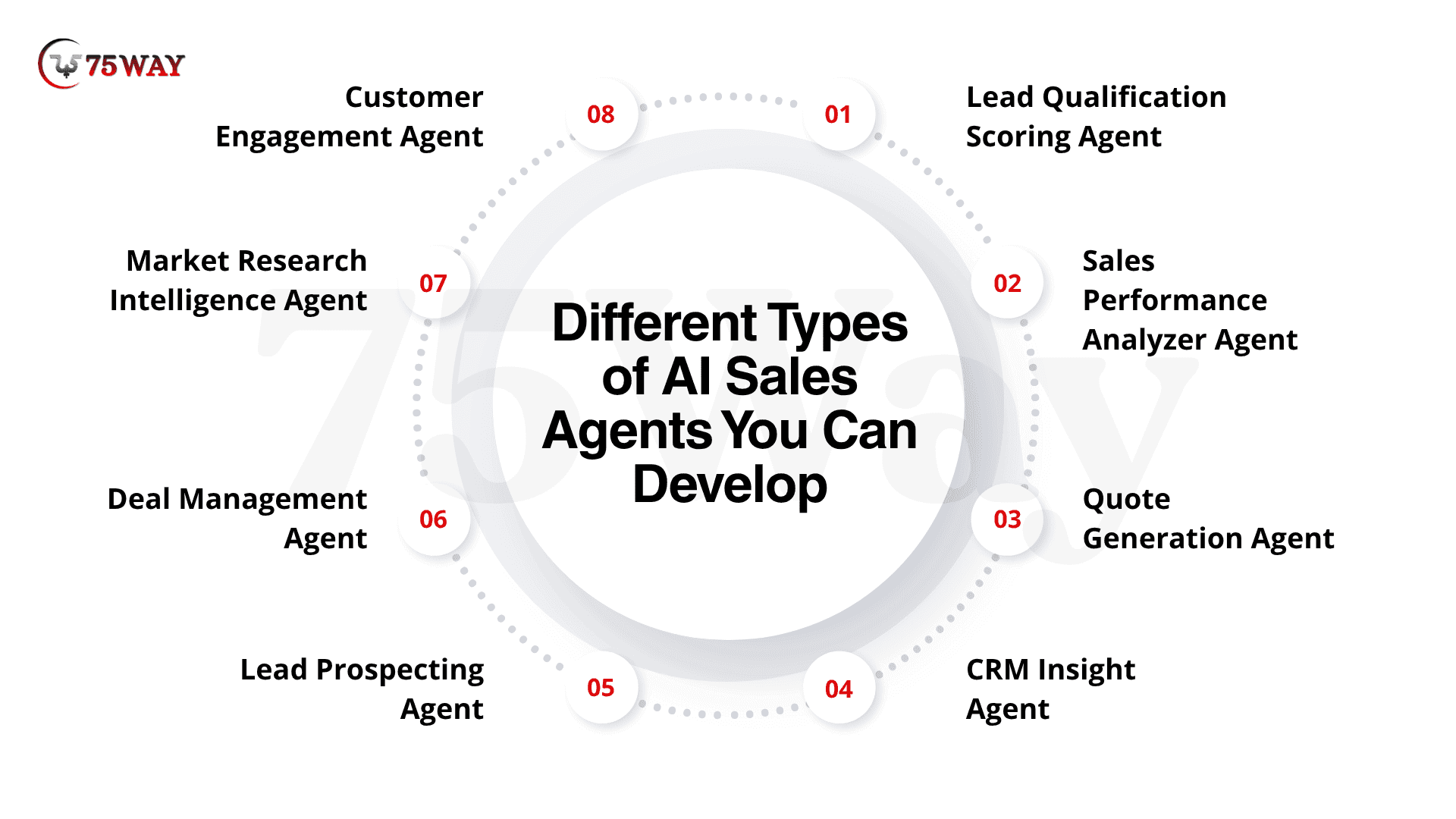 AI sales agents can be designed in multiple specialized categories to automate different stages of the sales lifecycle. Each type focuses on a specific business function such as lead scoring, pricing, forecasting, or customer engagement. Together, they help businesses streamline operations, improve accuracy, and increase revenue through structured automation across the entire sales funnel.