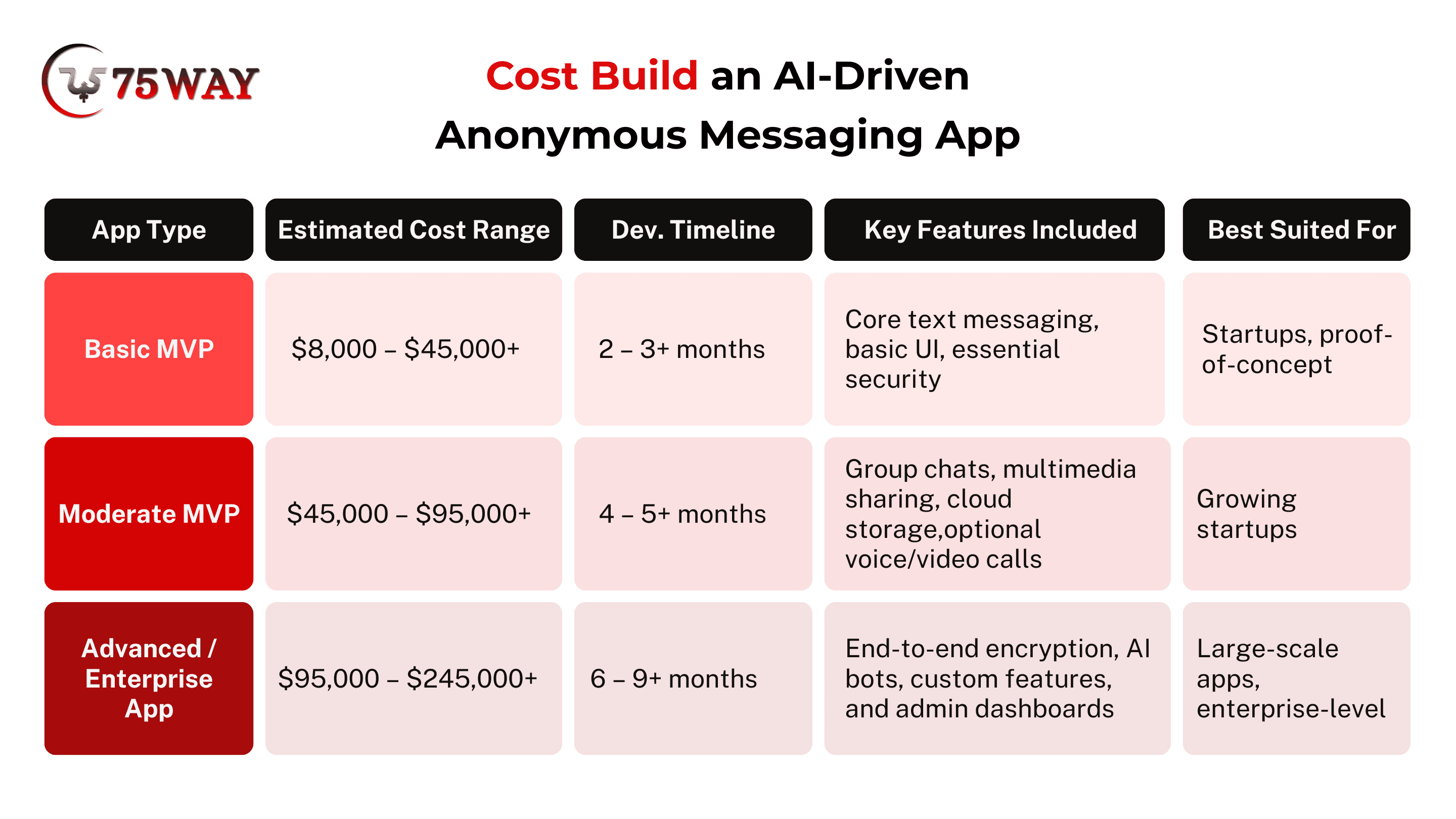 Advanced/Enterprise App: An advanced or enterprise app costs $95,000 to $245,000+ and usually takes 6 to 9 months to build. It includes end-to-end encryption, AI-powered bots, custom features, and admin dashboards for monitoring and analytics. It is perfect for large-scale applications or enterprise-level solutions. This tier supports high user volumes, regulatory compliance, and AI-driven moderation. This private messaging app offers robust security, seamless performance, and a strong foundation for continuous feature updates and growth in the competitive USA anonymous messaging market.