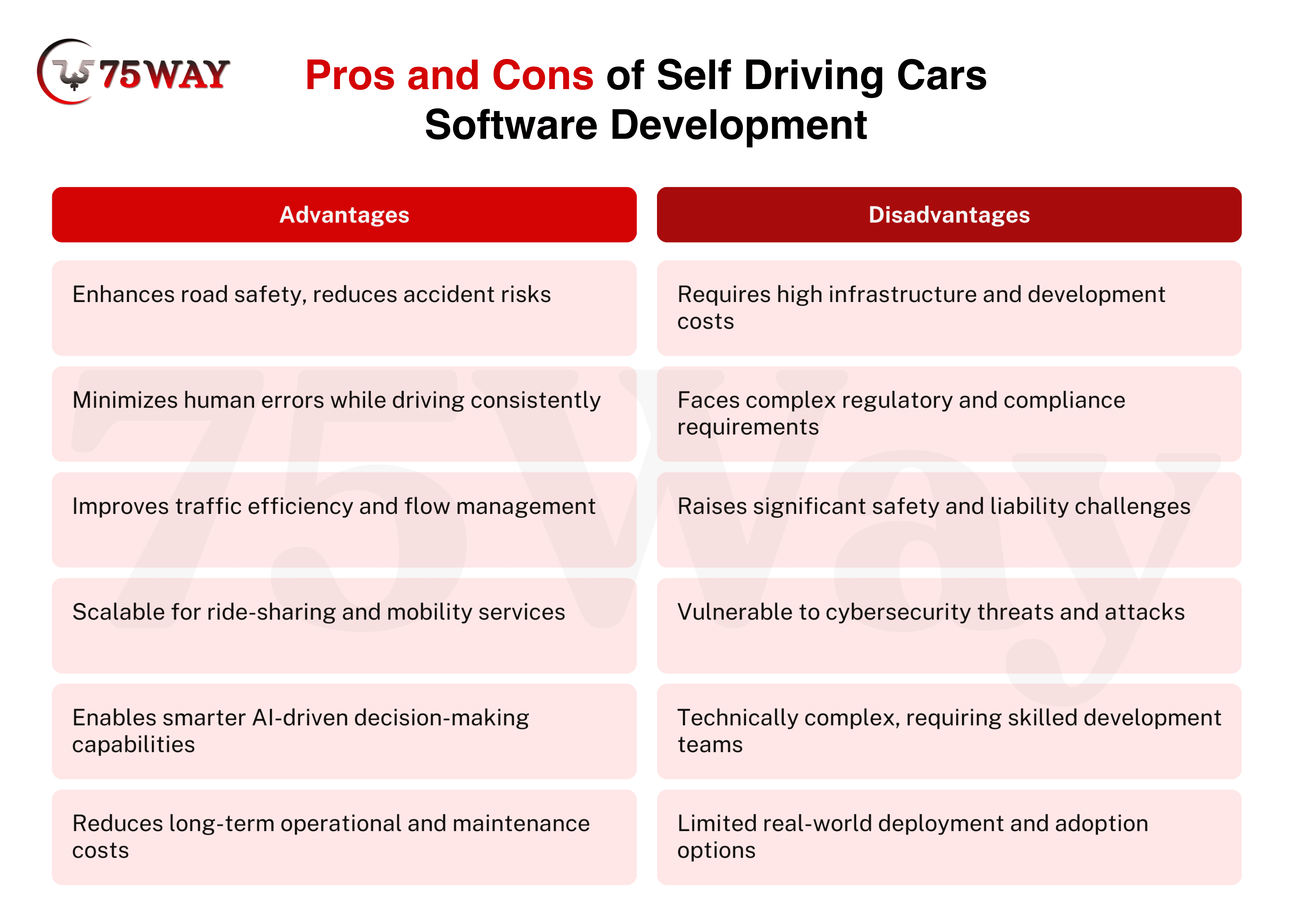 Autonomous car software offers immense benefits but also presents challenges. Founders have to understand the advantages and disadvantages to make informed decisions, balance investment risks, and plan deployment strategies. A clear view of trade-offs provides safety, scalability, and ROI while addressing regulatory and technical complexities.