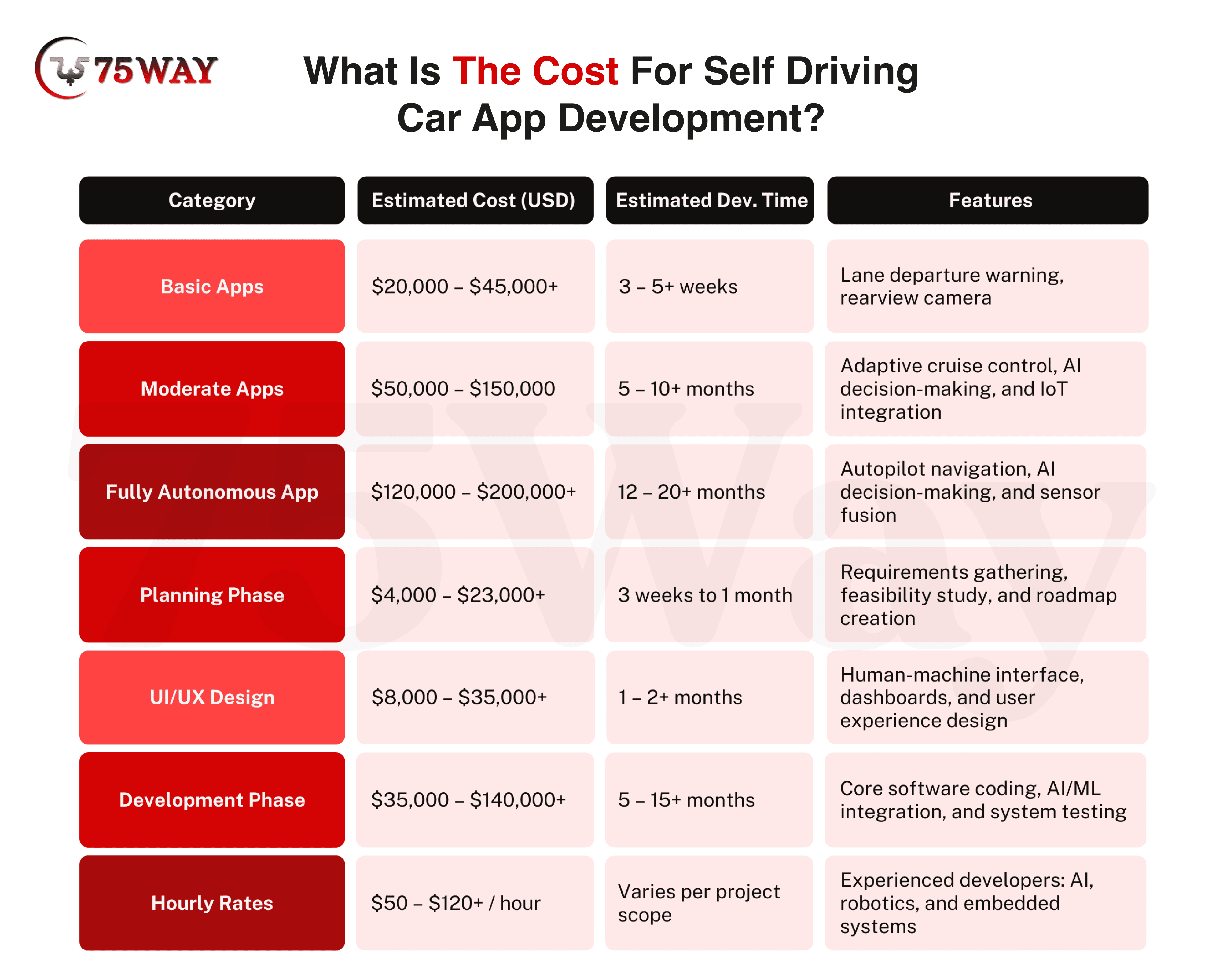 The cost to develop self-driving car software varies depending on complexity, autonomy level, and features. Basic apps focus on alerts and warnings, while fully autonomous apps integrate AI navigation, sensor fusion, and fleet management systems. Costs also vary with planning, design, and hourly developer rates.