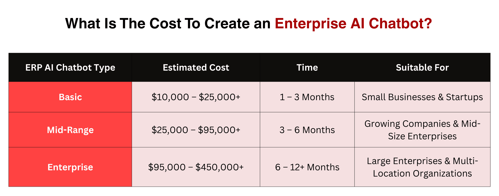 The cost to develop an ERP AI chatbot varies depending on complexity, features, and business size. Basic chatbots typically range from $10,000 to $25,000 and can be implemented within 1–3 months, making them ideal for small businesses and startups. Mid-range solutions, designed for growing companies or mid-size enterprises, cost between $25,000 and $95,000, with development timelines of 3–6 months. Enterprise-level chatbots for large organizations or multi-location operations require larger investments, ranging from $95,000 to $450,000+, and can take 6–12 months or more to fully deploy and integrate with existing systems.