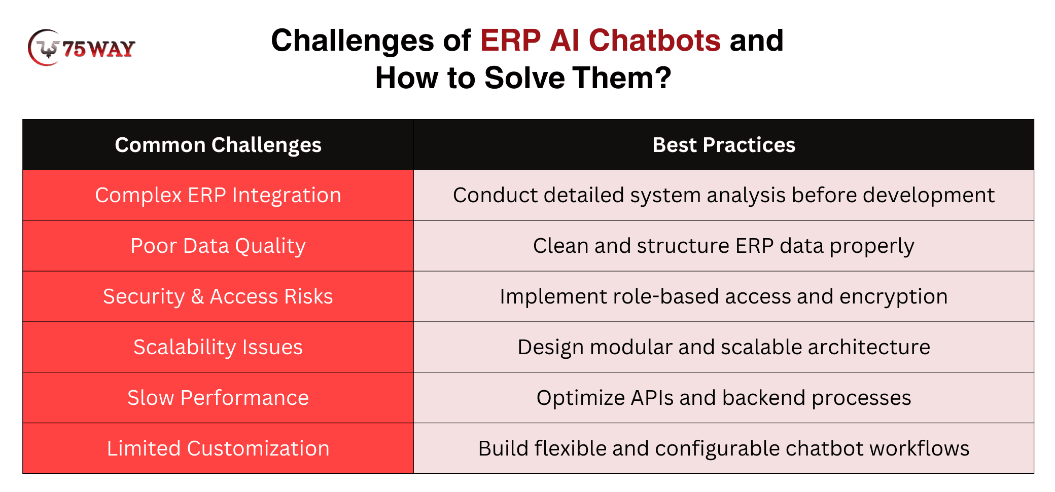 ERP AI chatbots face challenges such as complex system integration, poor data quality, security risks, scalability issues, and limited customization. To address these challenges, you require thorough system analysis, structured and clean data, robust security measures, modular architecture, and flexible workflows. A proactive planning ensures chatbots deliver reliable performance, enhance efficiency, and support enterprise growth effectively.