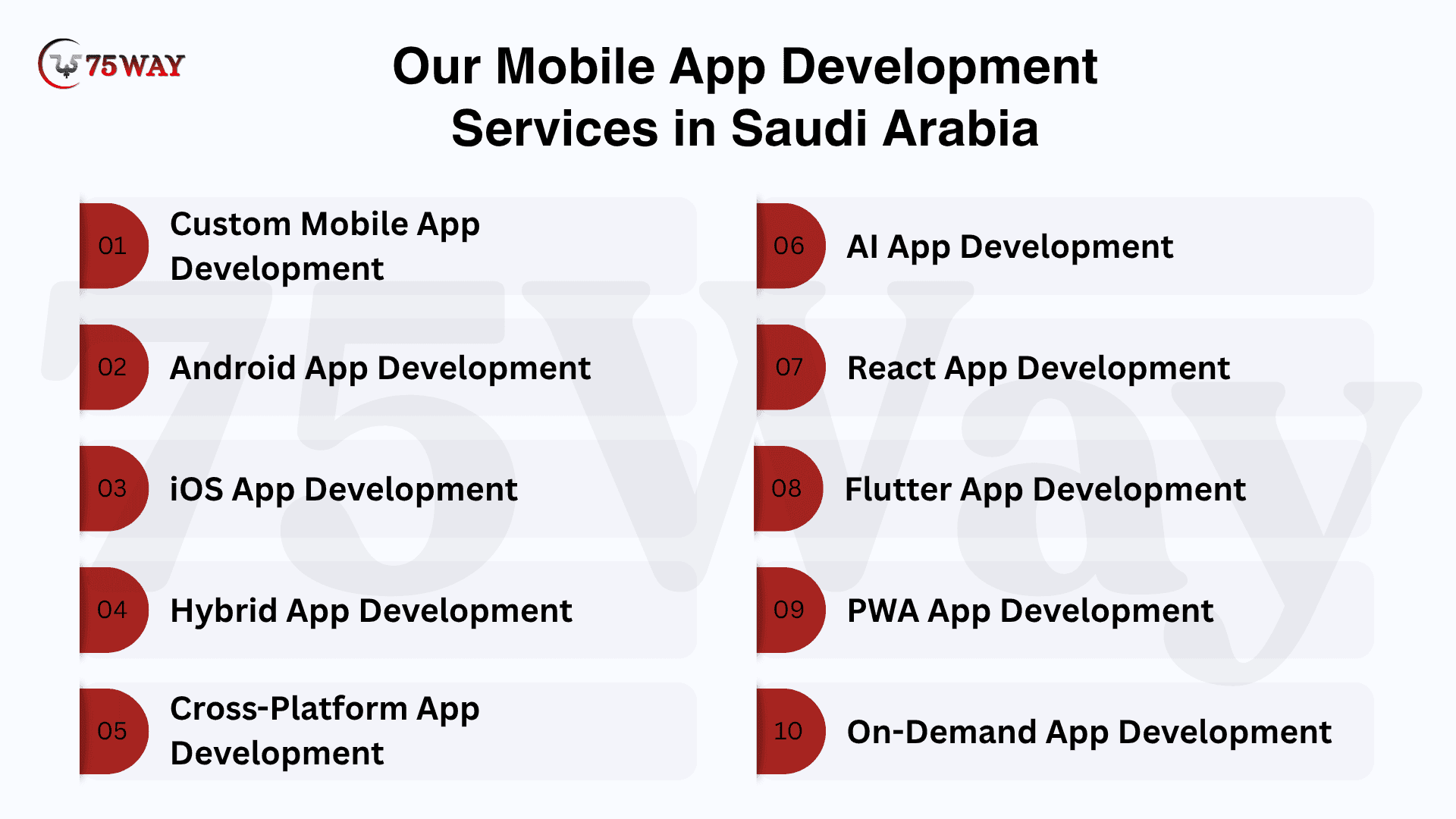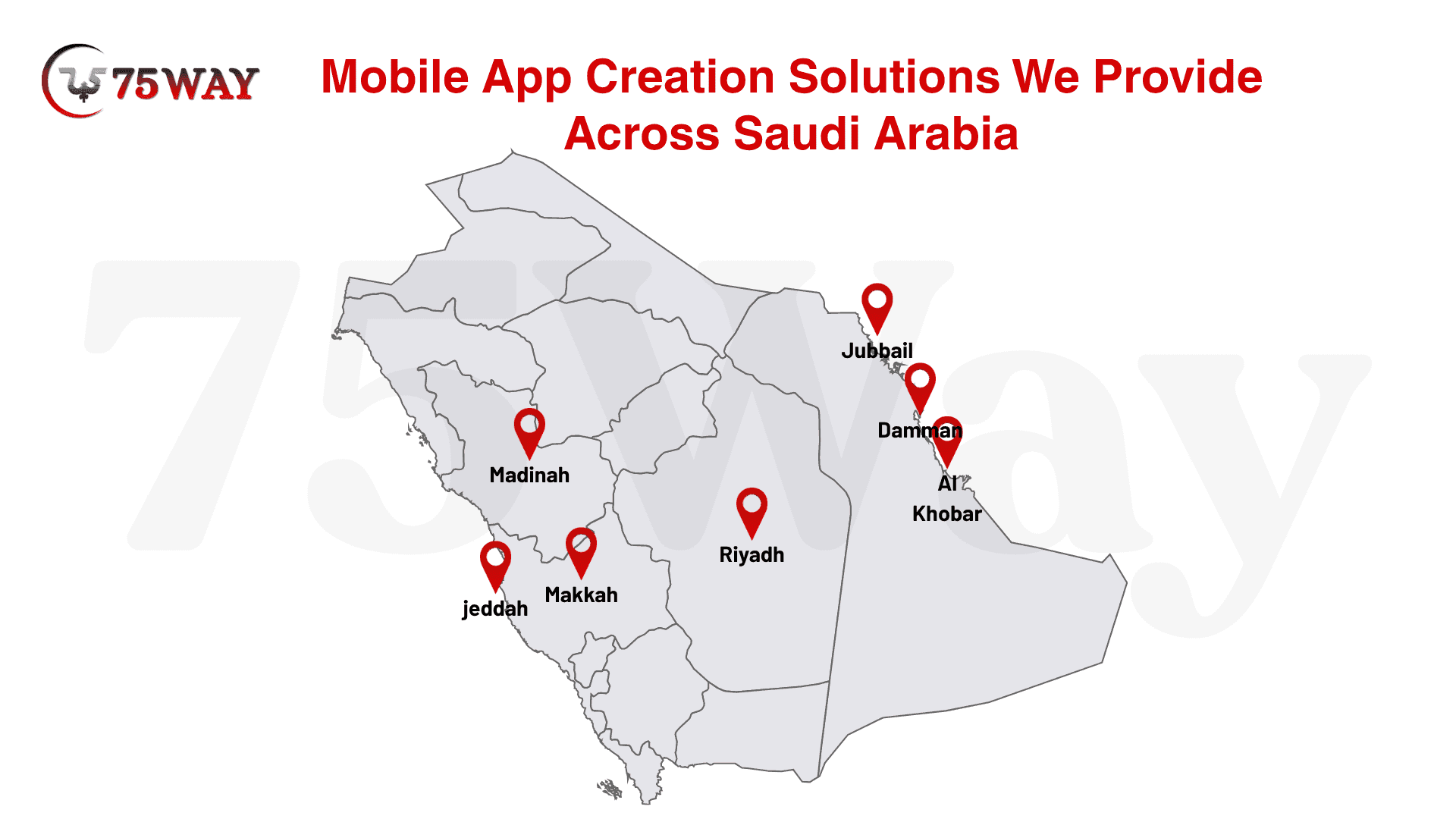 Discover high-quality mobile app solutions across Saudi Arabia with 75way Technology. Our services cover major cities including Jeddah, Makkah, Madina, Riyadh, Al Khobar, Dammam, and Jubail, ensuring strong local support and accessibility. As a trusted mobile app creation company in Saudi Arabia (KSA), we focus on seamless integrations, efficient management, and user-centric design. Strengthen your digital presence with innovative mobile solutions designed to support long-term growth and sustained business success.