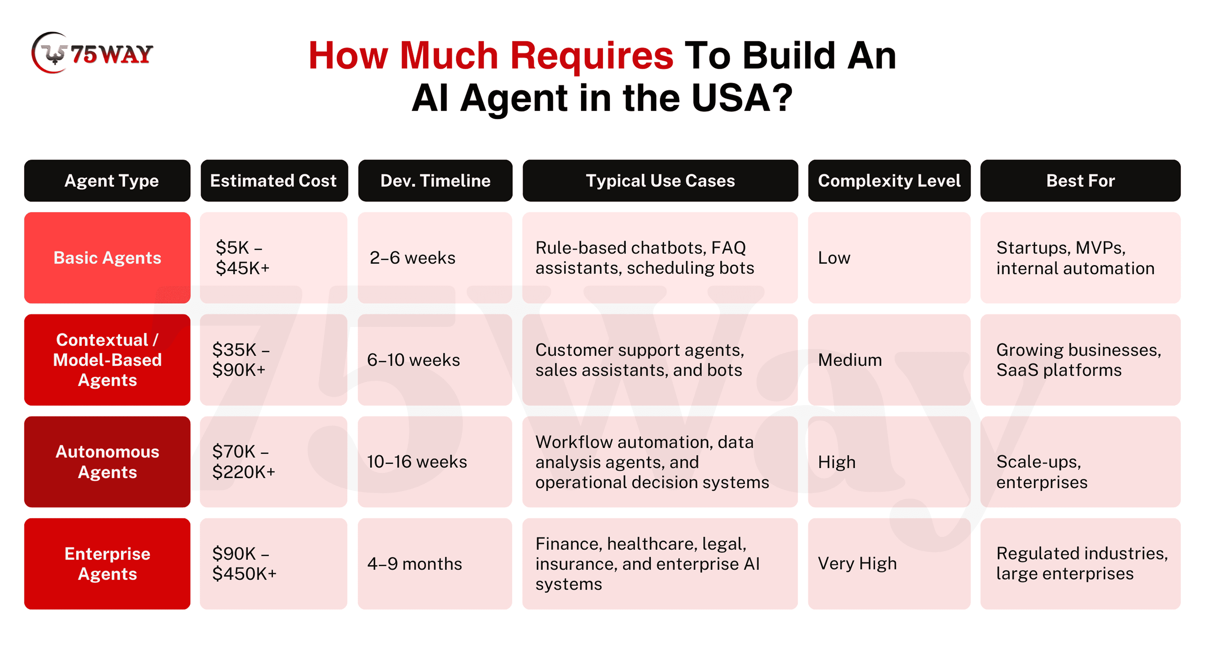 Model-Based AI Agents Cost: Contextual or model-based AI agents operate with a deeper understanding and limited reasoning capabilities. They are commonly used for customer support, sales assistants, and interactive bots. The development costs for model-based AI agents range from $35,000 to $90,000+, with timelines of 6 to 10 weeks.