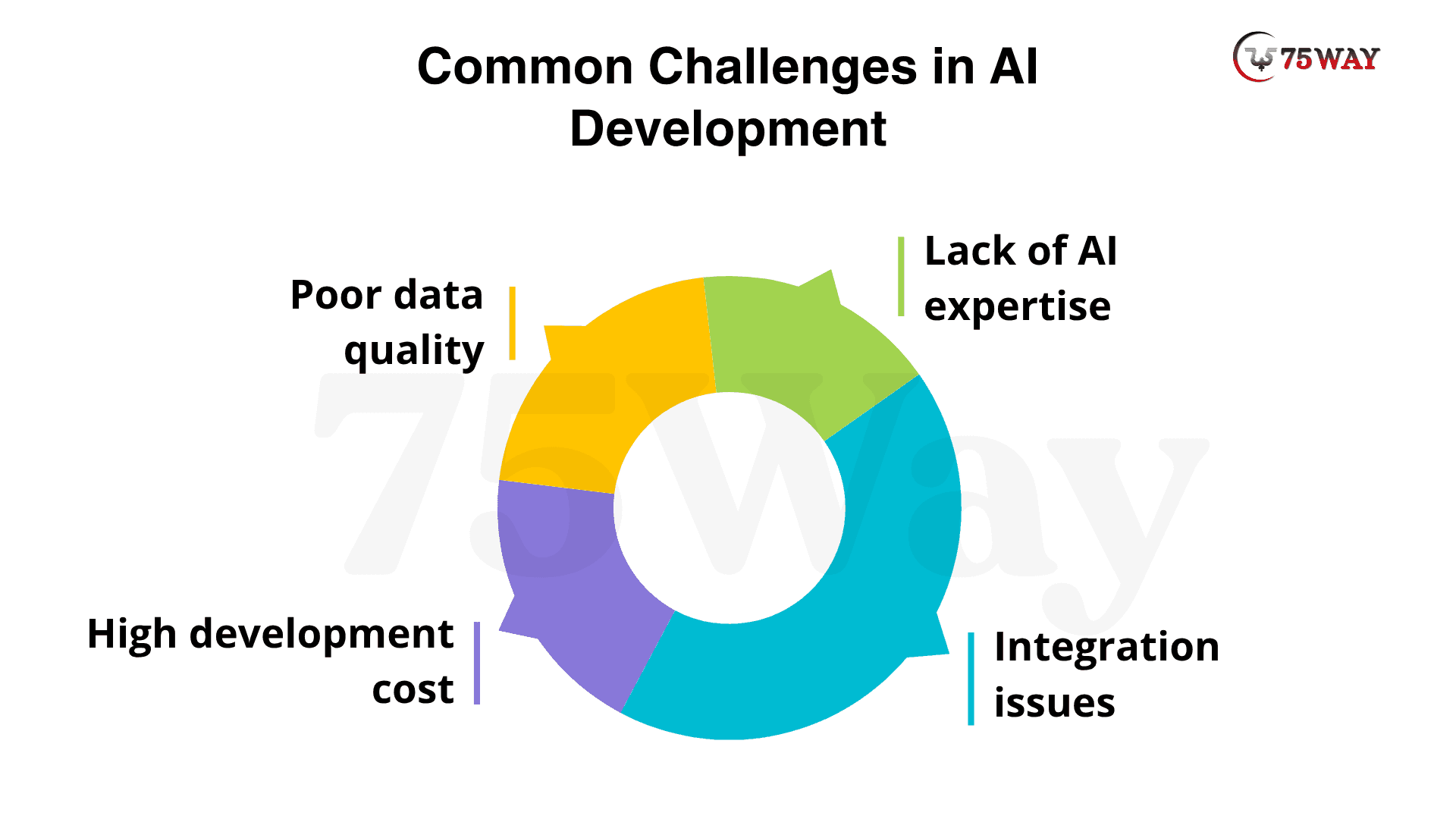 AI development faces challenges, including data quality issues, high implementation costs, talent shortages, algorithm complexity, integration with existing systems, scalability concerns, ethical considerations, and maintaining model accuracy over time, all of which can impact project success and business outcomes.
