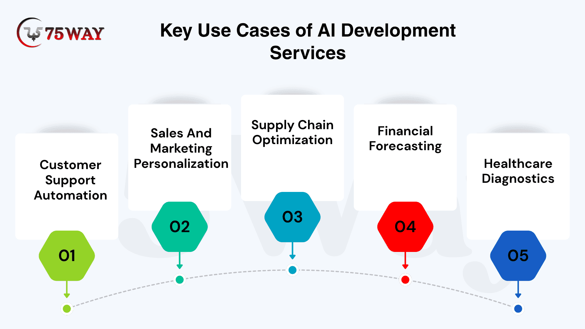 AI development services are applied across industries to automate processes, enhance decision-making, improve customer experiences, enable predictive analytics, power chatbots and virtual assistants, optimize supply chains, detect fraud, and drive innovation through intelligent insights and adaptive, data-driven solutions.