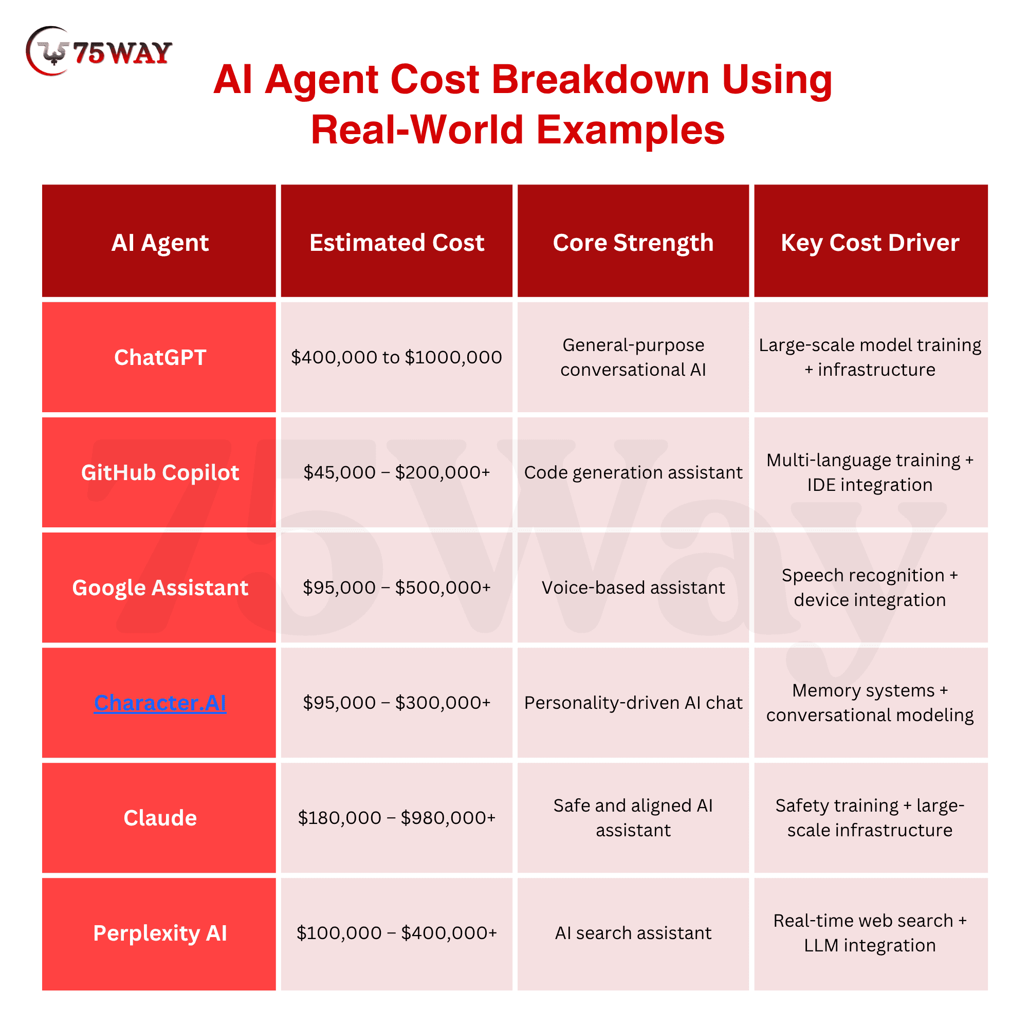 Real-world AI agents demonstrate how development cost varies dramatically based on scale, architecture, and intended use case. Systems like ChatGPT, GitHub Copilot, Google Assistant, Character.AI, Claude, and Perplexity AI are built using advanced machine learning models, large-scale data processing, and complex infrastructure setups. Their costs range from hundreds of thousands to multi-million dollars, depending on factors.