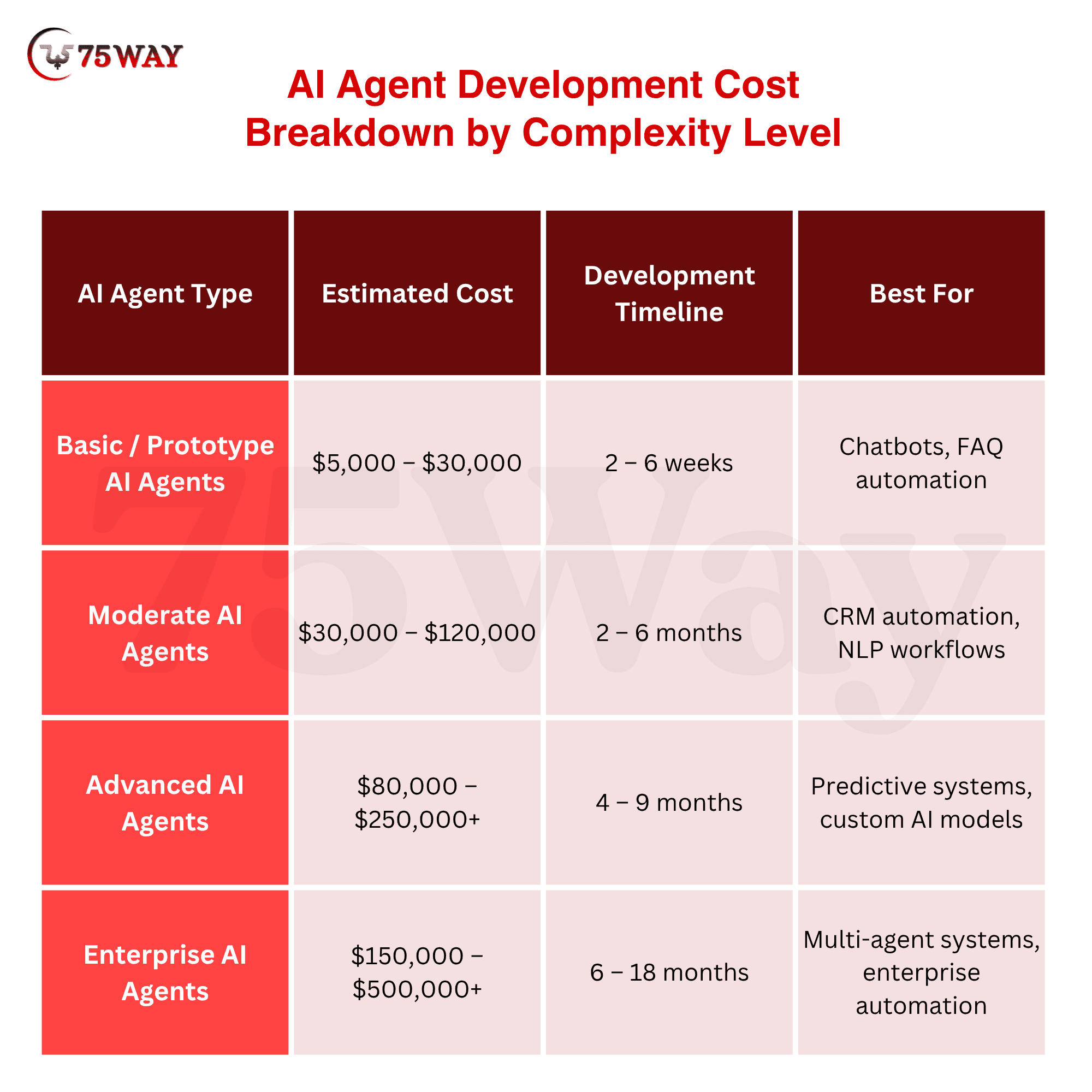 In most real-world applications, AI agent development costs range from $5,000 to $500,000+, depending on system complexity, level of autonomy, AI model architecture, data requirements, and integration depth. In advanced enterprise environments, especially those involving multi-agent systems and real-time reasoning capabilities, costs can exceed this range.