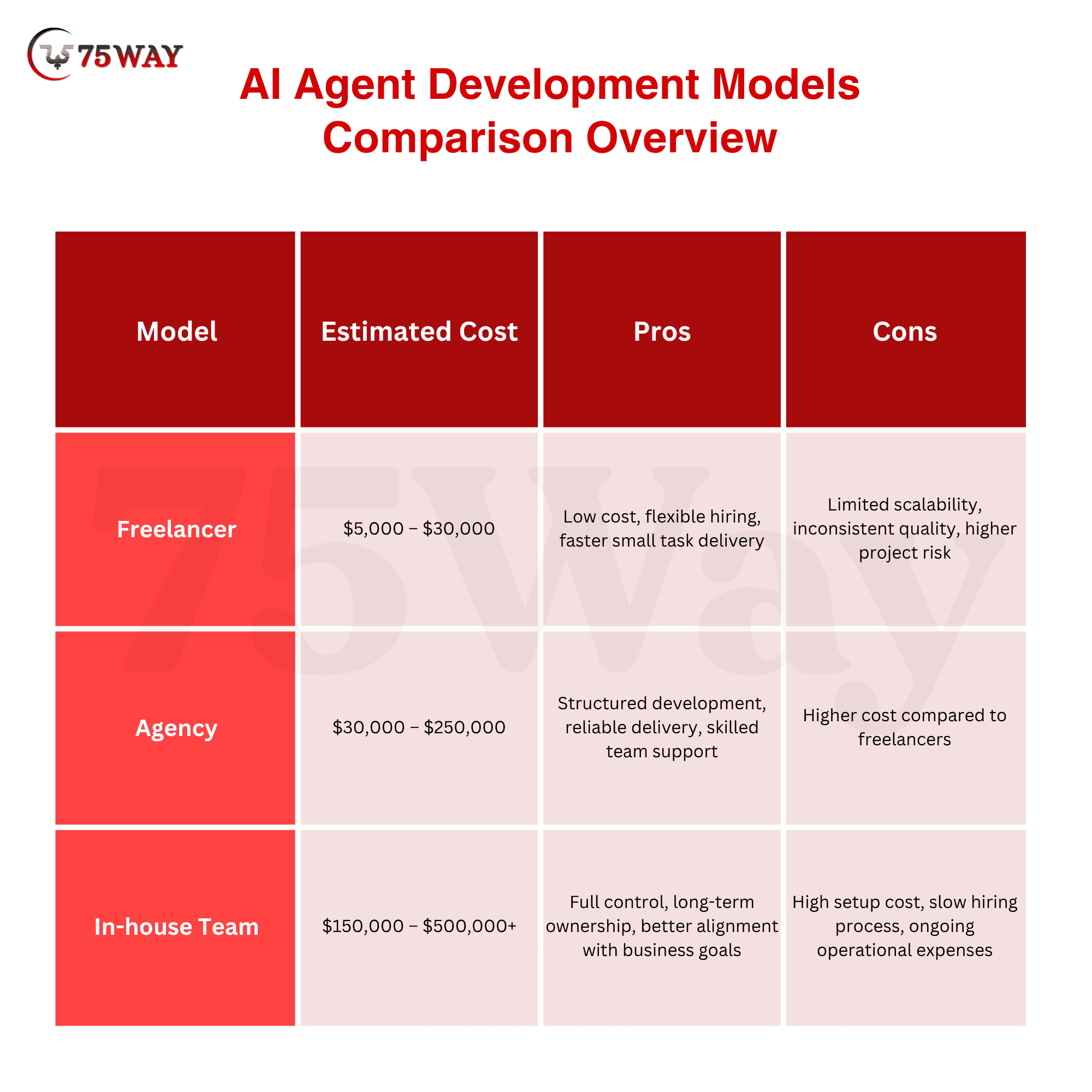 Choosing the right development model for AI agent development significantly impacts overall cost, scalability, and long-term performance. Businesses typically choose between freelancers, agencies, and in-house teams based on budget availability, project complexity, and the level of control required over the development process. Each model has distinct advantages and limitations, influencing not only initial development costs but also maintenance, execution speed, and system reliability. Understanding these differences helps organizations make informed decisions aligned with both technical needs and financial constraints.