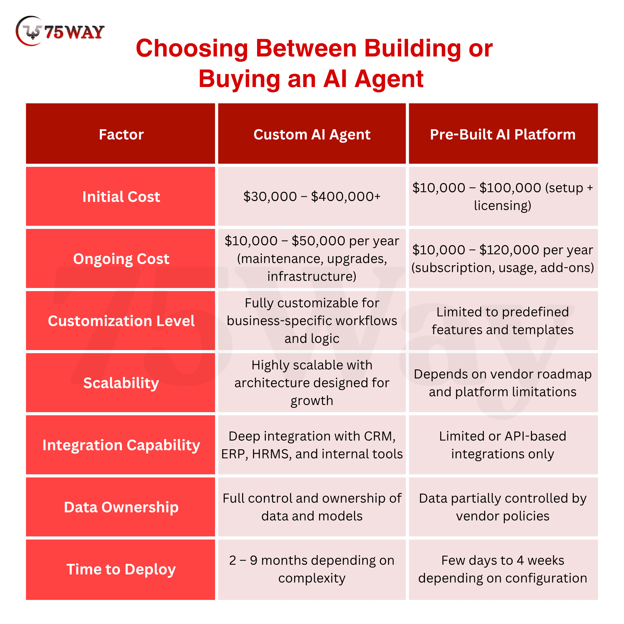 Deciding between building a custom AI agent or buying a pre-built solution depends on your business complexity, budget, scalability needs, and long-term control requirements. Custom development offers full flexibility and deep integration with internal systems, making it ideal for advanced and evolving use cases. On the other hand, pre-built platforms provide faster deployment and lower upfront cost but come with limitations in customization and scalability. The right choice depends on whether your priority is long-term ownership or quick implementation with lower initial investment.