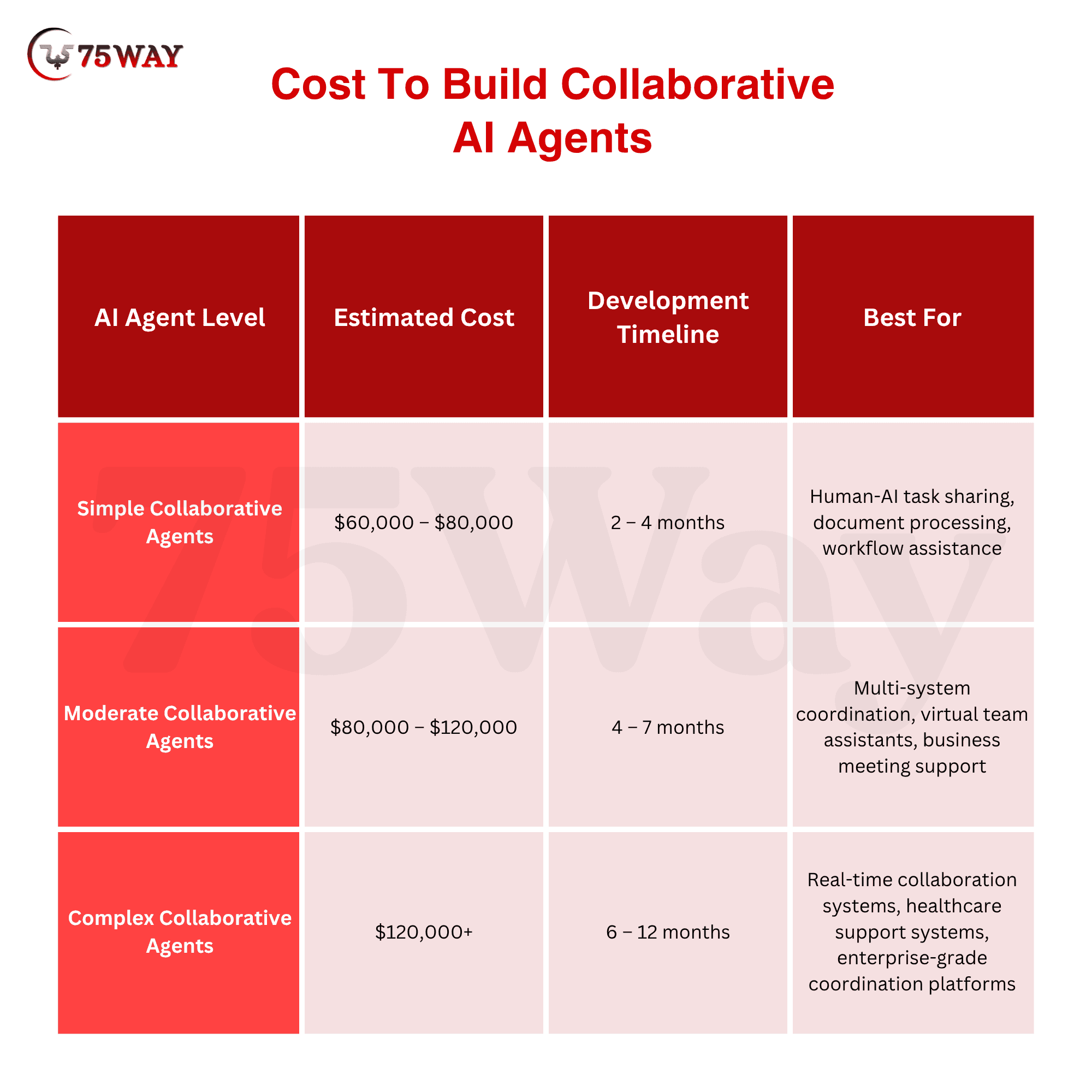 - Moderate Collaborative Agents: $80,000 – $120,000Agents are coordinating effectively with shared data, improving teamwork and task efficiency.