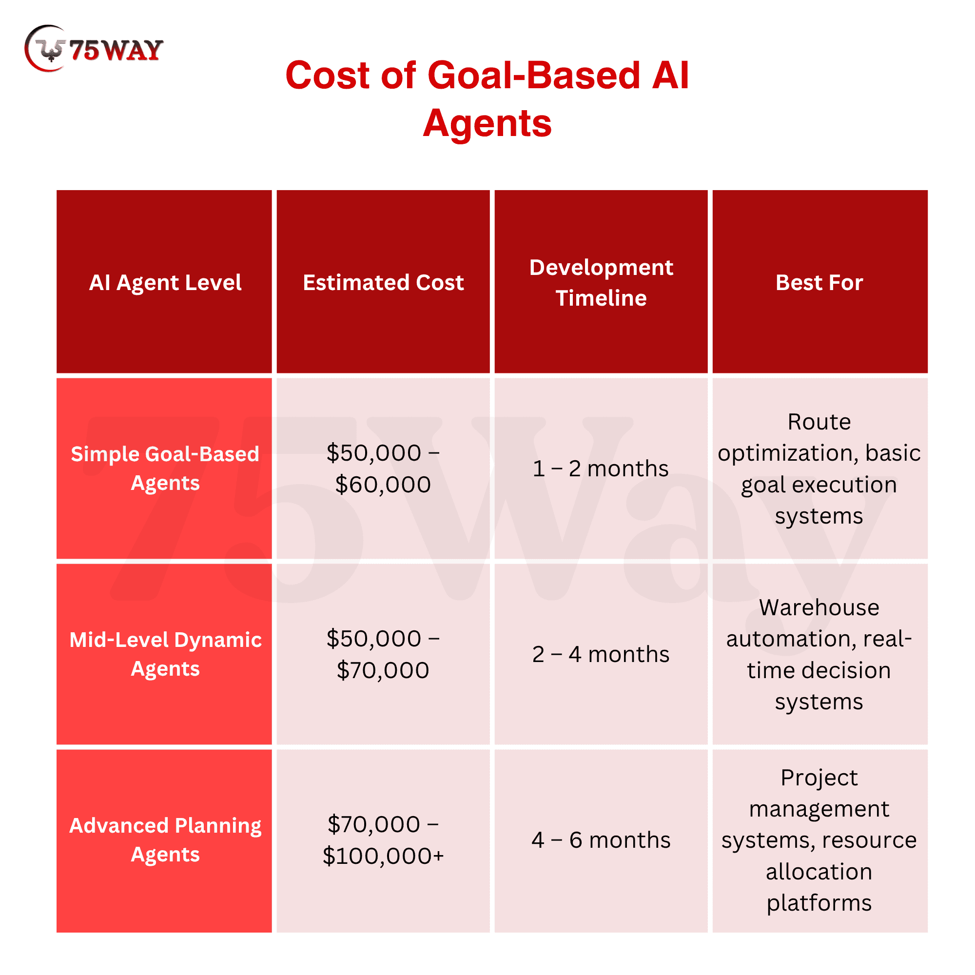 - Mid-Level Dynamic Goal-Based Agents: $50,000 – $70,000Agents adapting to changing conditions with flexible logic and improved decision processes.