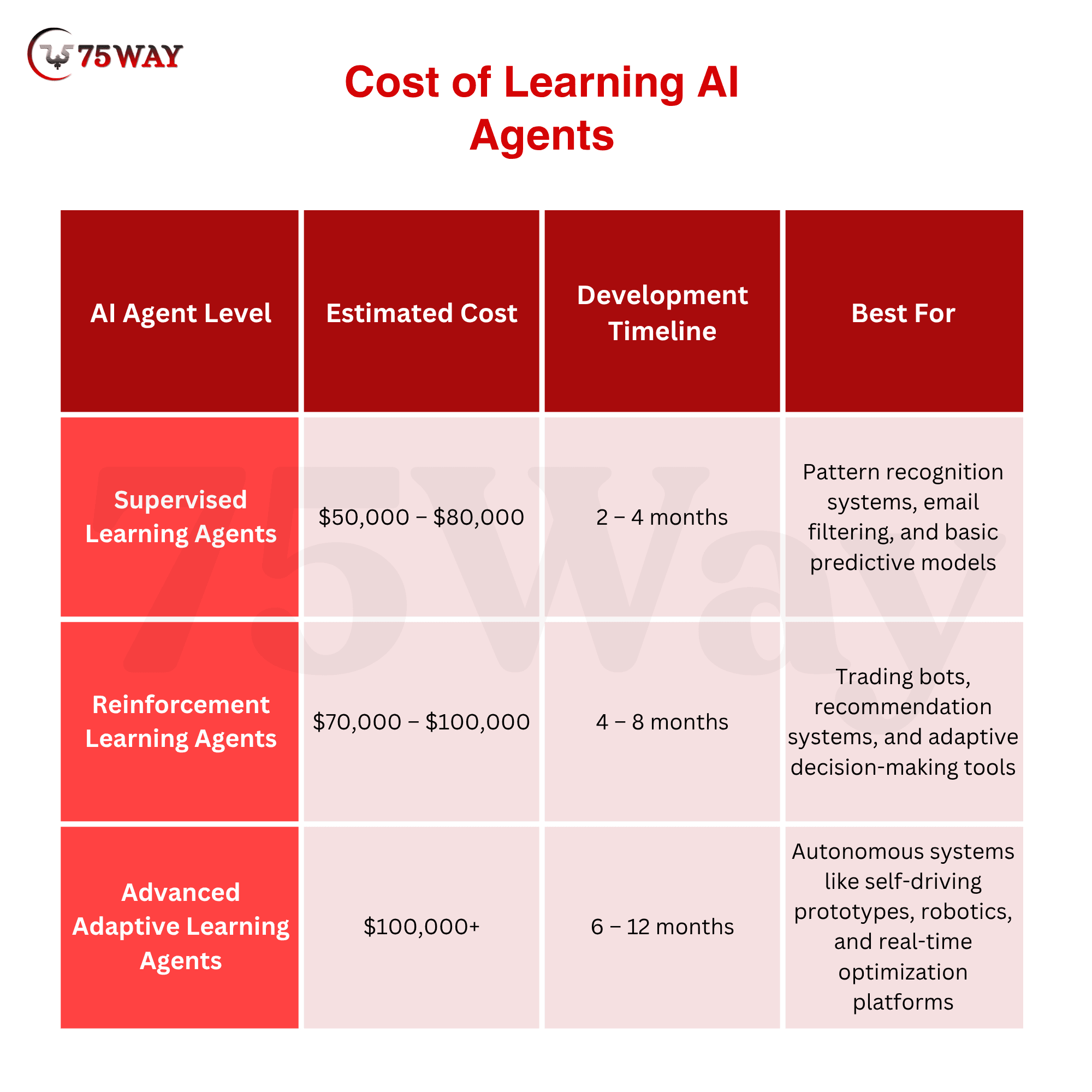 - Reinforcement Learning Agents: $70,000 – $100,000Agents learn through rewards and feedback to optimize actions over time.