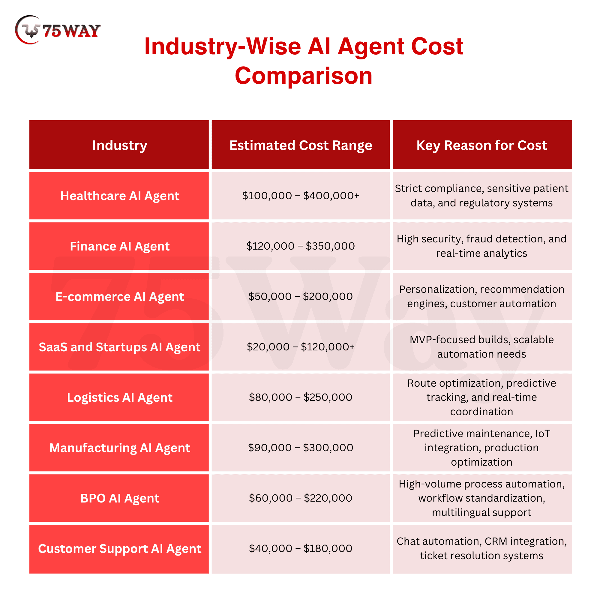 AI agent development cost varies significantly across industries due to differences in compliance requirements, data sensitivity, integration complexity, and scalability needs. Sectors such as healthcare and finance require highly secure and regulation-compliant systems, which increase development effort and overall investment. In contrast, industries like SaaS and startups often focus on MVP-level automation, making their initial development comparatively more cost-effective.