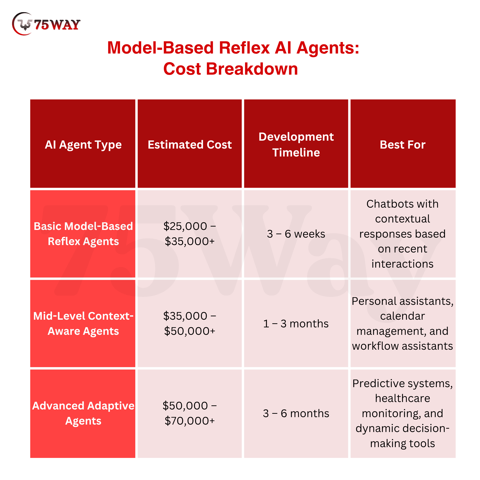 - Basic Model-Based Reflex Agents: $25,000 – $35,000+Agents using internal state models to make decisions beyond immediate inputs.