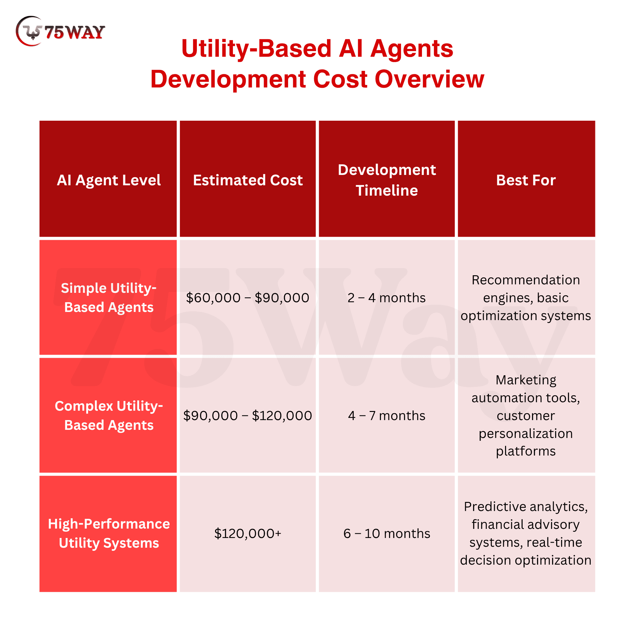 - Simple Utility-Based Agents: $60,000 – $90,000Agents make decisions by evaluating outcomes to maximize utility in simple environments.