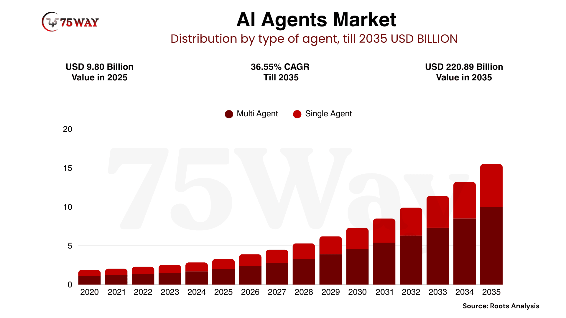 - The global AI agents market is projected to grow from $9.8 billion in 2025 to $220.9 billion by 2035, reflecting a strong CAGR of 36.55%, according to the Root Analysis report.
