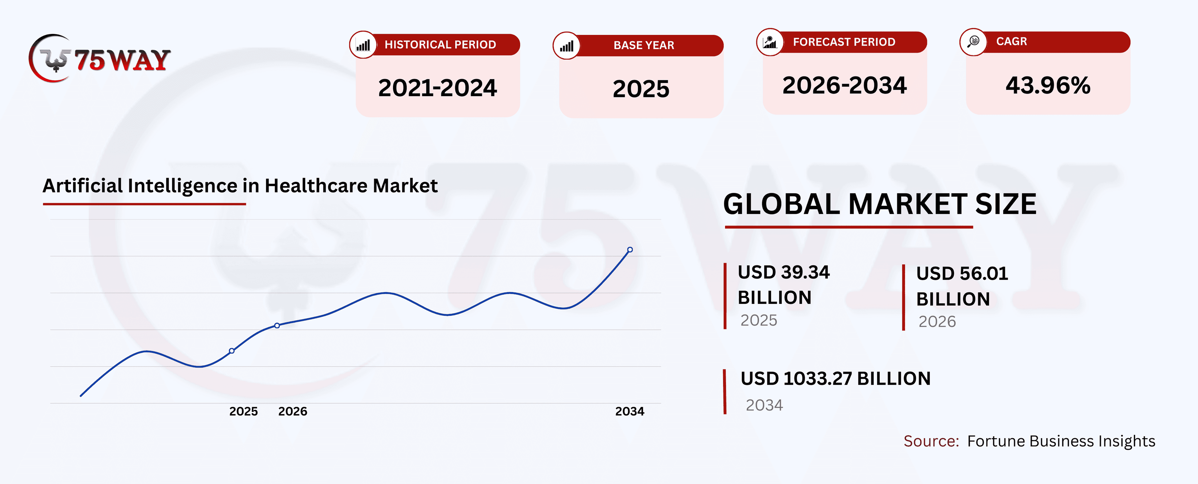 - The global AI in healthcare market is expected to reach $1,033.27 billion by 2034, growing at a CAGR of 43.96% during the forecast period.