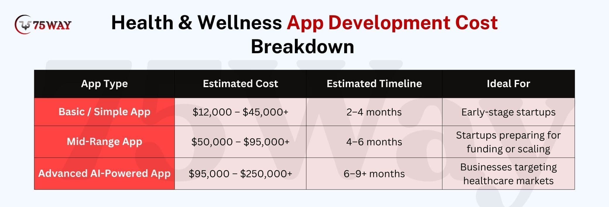 Advanced Healthcare App Cost: The cost to build an advanced health and wellness app ranges from $95,000 – $250,000+, taking 6–9+ months. This tier targets startups aiming for large-scale adoption, FDA SaMD readiness, and enterprise or payer partnerships. Full HIPAA compliance, bias mitigation, and post-launch AI optimization are built into the architecture.