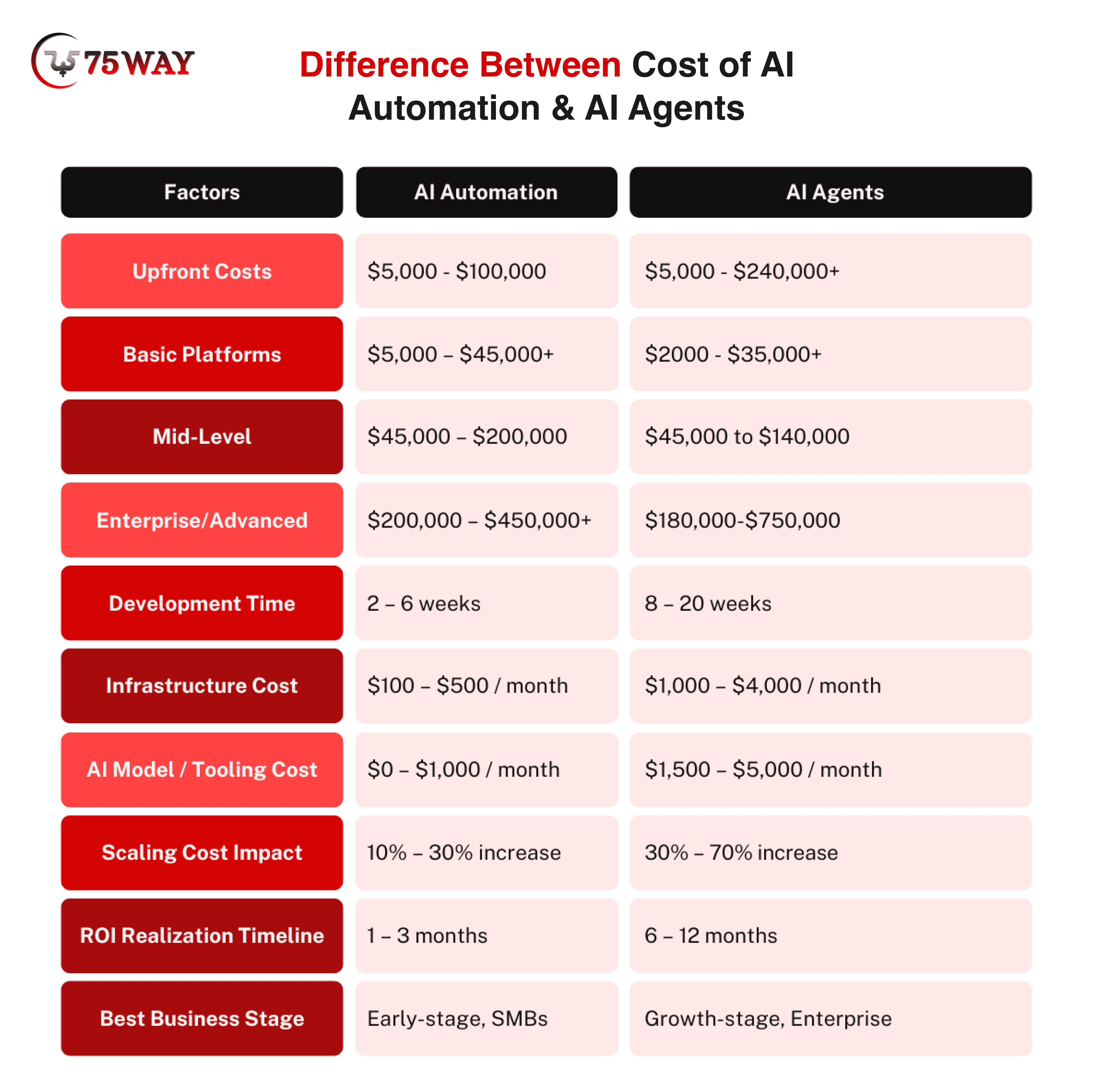 AI automation is generally much cheaper than AI agents because it focuses on predictable, rule-based tasks. The upfront costs are lower, development time is shorter, and infrastructure requirements are minimal. This makes automation ideal for startups and SMBs that look for fast ROI without heavy investment.