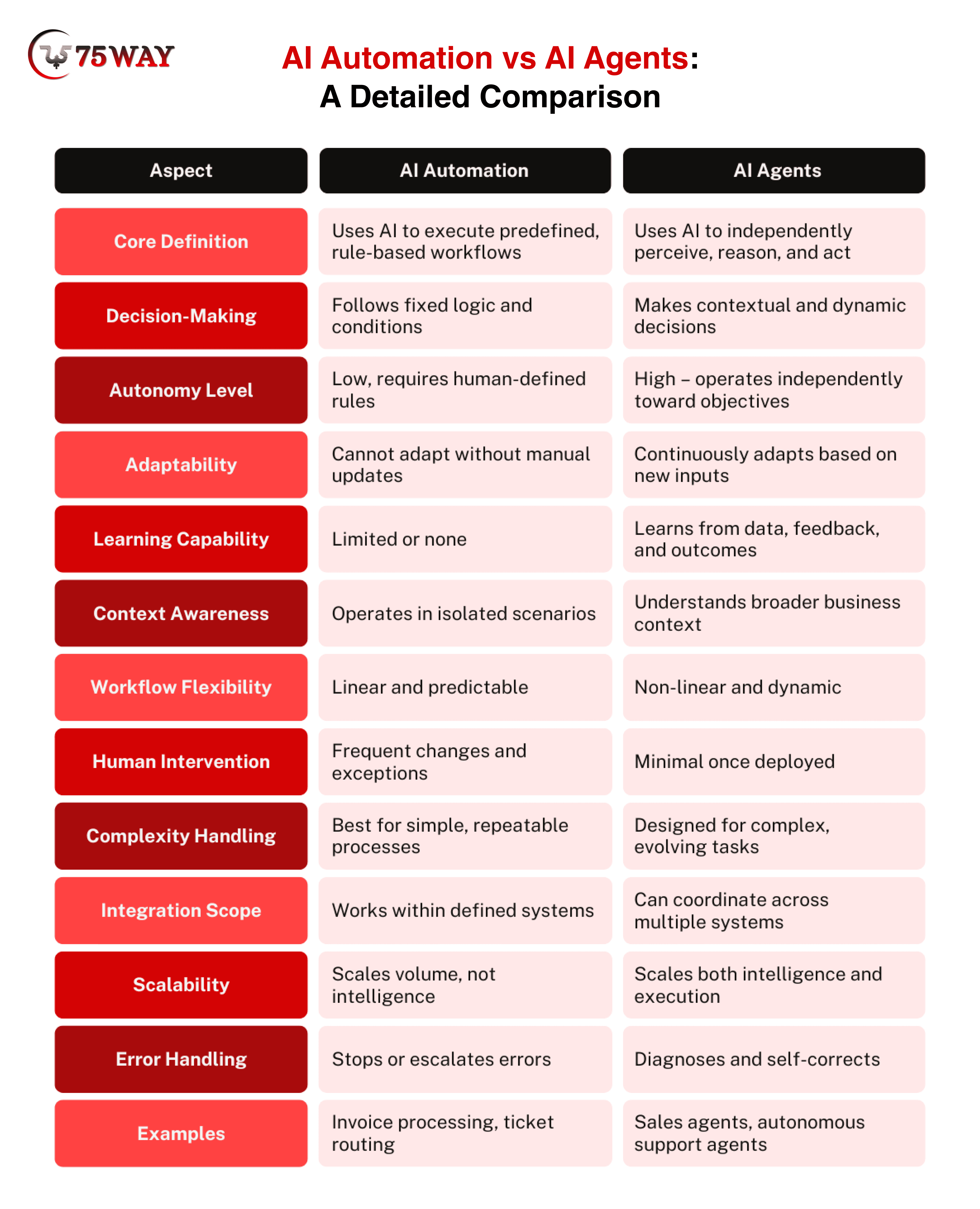 Now you know what the AI automation and AI agents are. It is time to understand the difference between AI Automation Vs. AI Agents. AI automation focuses on performing tasks exactly as defined, while AI agents focus on deciding what action makes the most sense in a given situation. This core difference influences how systems behave, scale, and deliver long-term value for businesses. Below is a deeper, practical explanation of each dimension, written to help founders, operators, and decision-makers clearly understand where each technology fits.