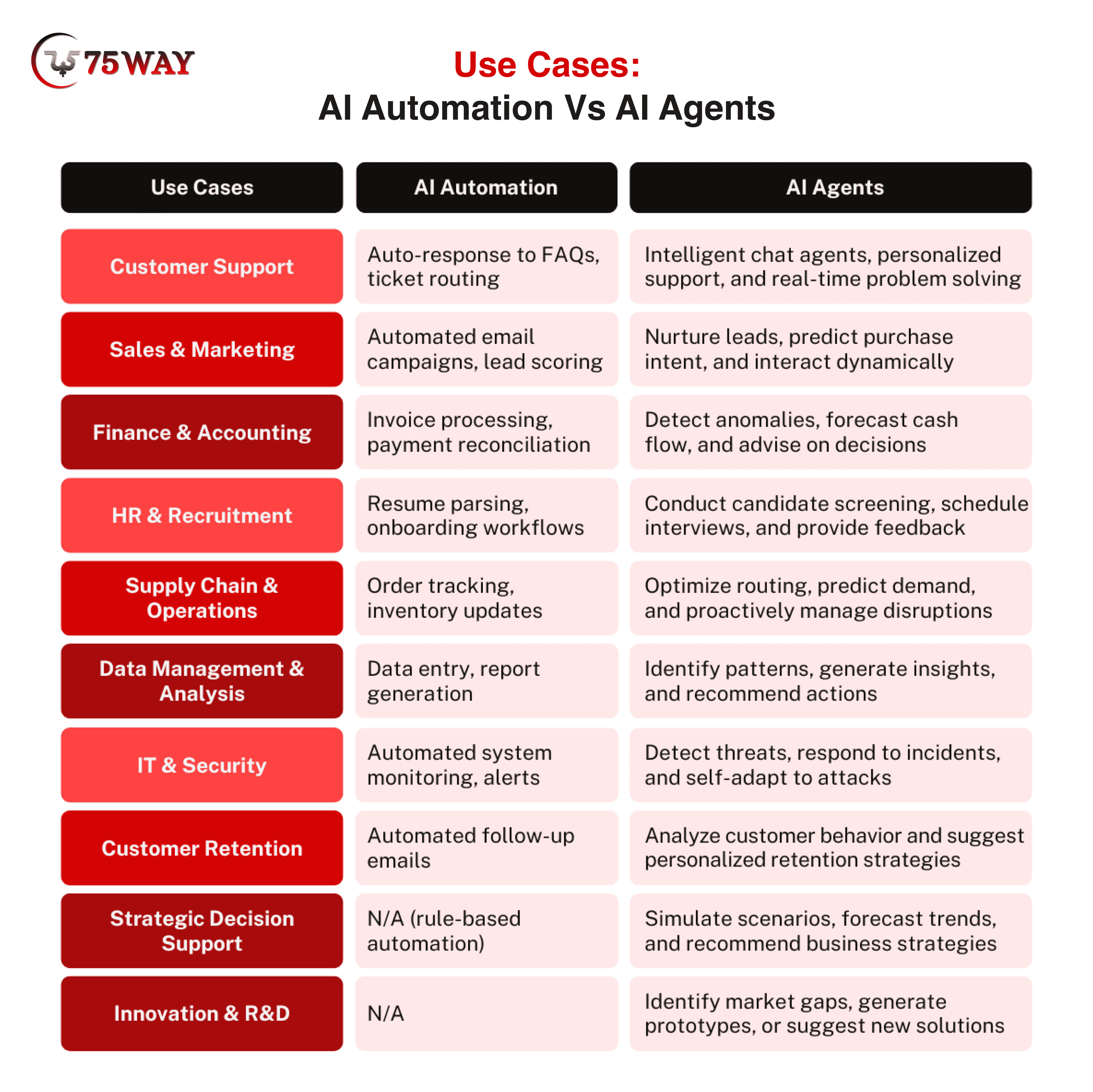 Innovation & R&D: AI automation has limited applicability in research or innovation, as these areas demand creativity and contextual understanding. AI agents identify market gaps, analyze competitor offerings, suggest prototypes, and even recommend new solutions based on emerging patterns. They combine multiple data sources to anticipate trends and provide actionable insights. In simple terms, if artificial intelligence automation handles execution, AI agents drive creativity and opportunity discovery.