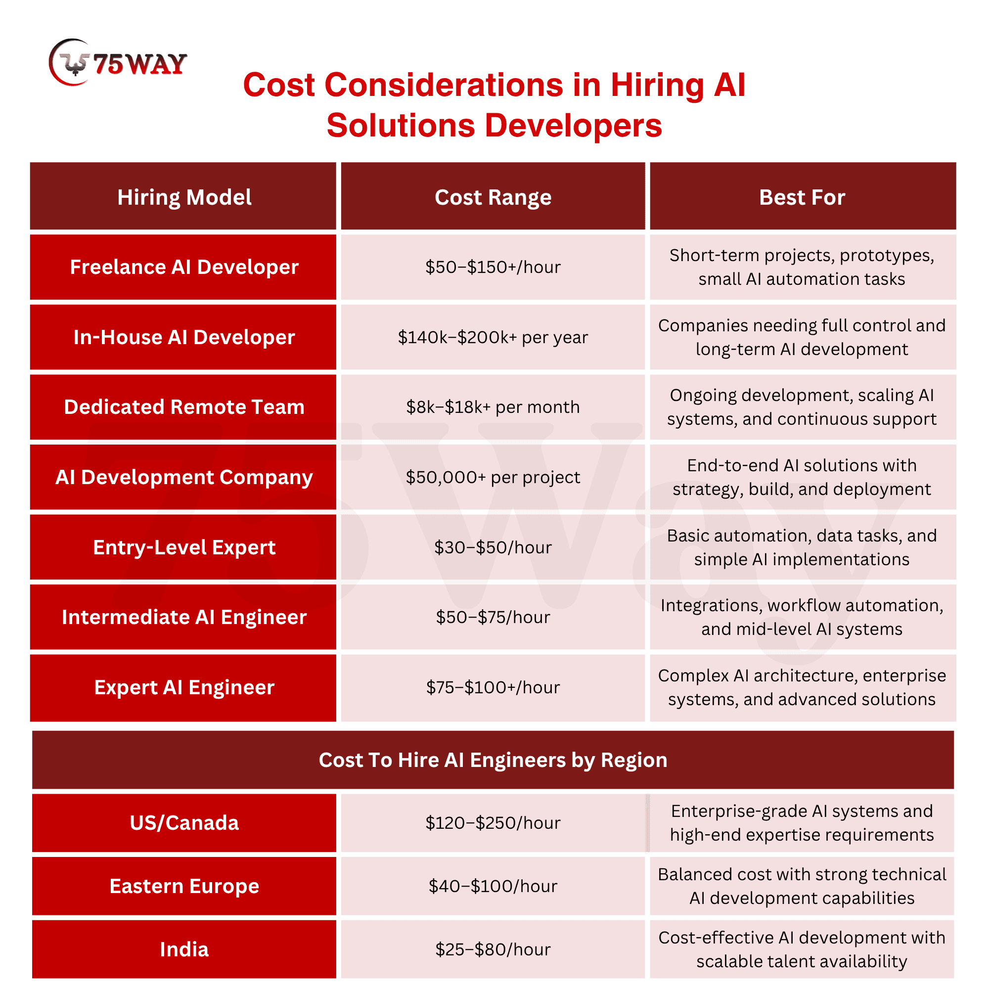 - AI developer hiring costs average $50 to $150 hourly based on requirements