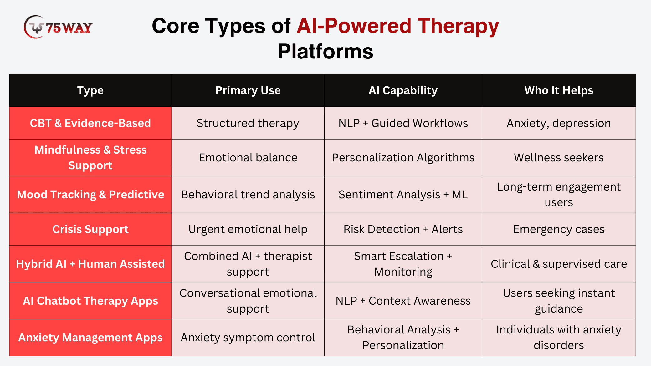 AI-powered therapy platforms are designed around different therapeutic goals, user emotions, and levels of clinical supervision. Below is a clear breakdown of each type, including what they actually do in practice.