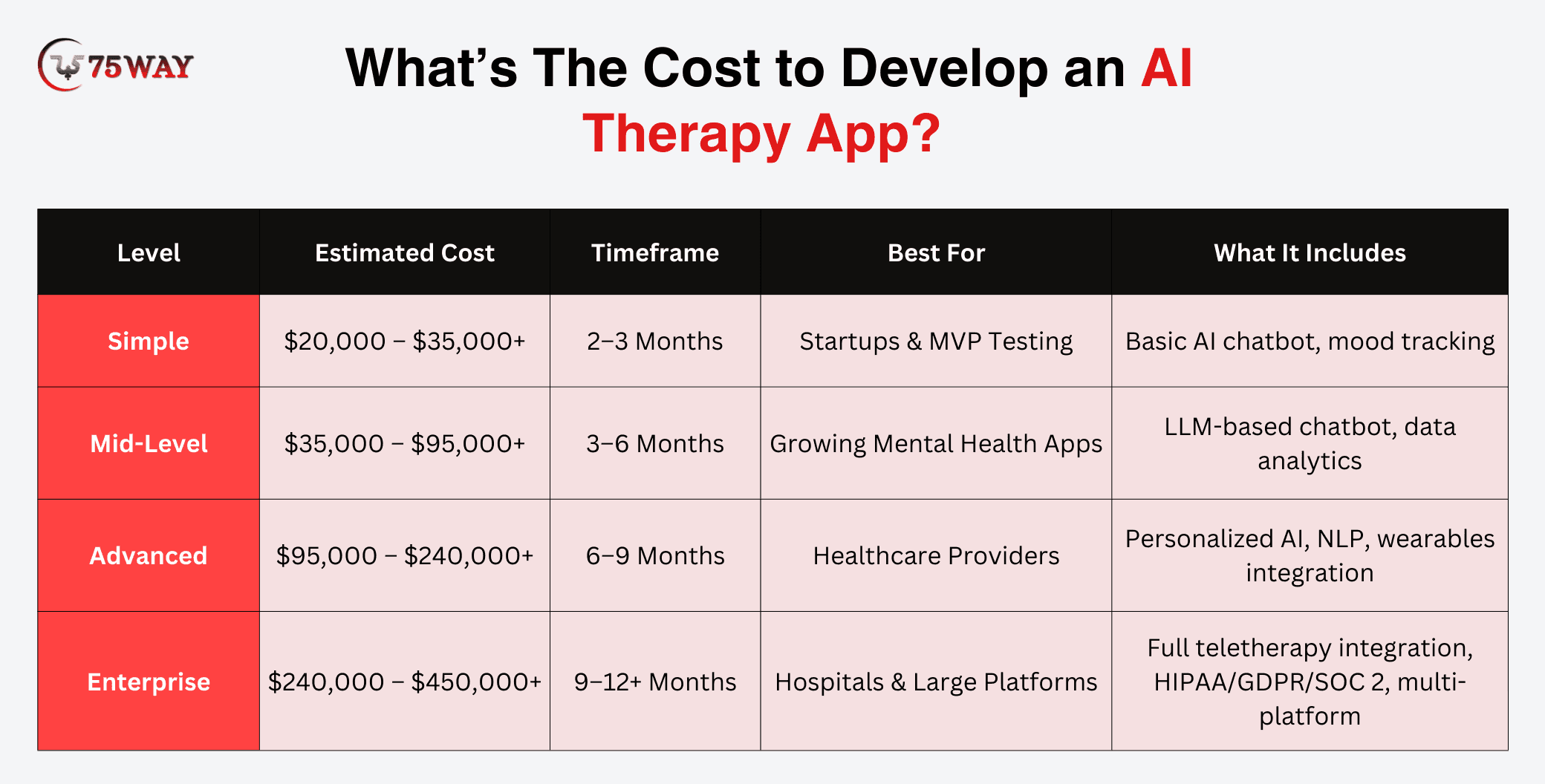 Mid-Level AI Therapy App Cost: A more refined platform usually falls between $35,000 and $95,000+, with an estimated timeline of 3–6 months. At this stage, the app incorporates LLM-powered conversations, personalized progress dashboards, structured analytics, improved UI/UX design, and scalable backend foundations.
