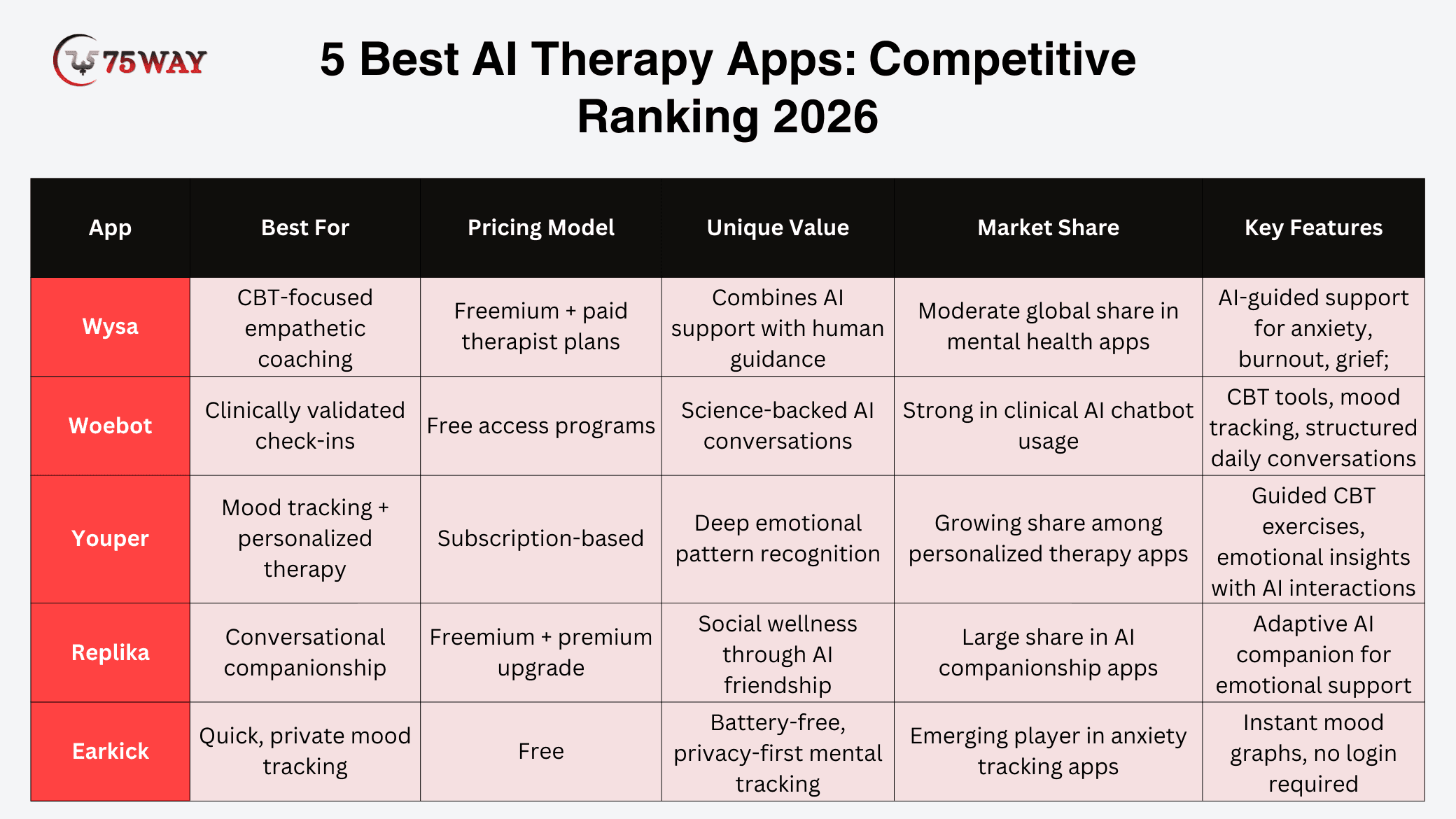 This AI therapy app offers mood tracking, coping exercises, and evidence-based programs for anxiety and stress. Its freemium model makes basic support accessible while offering paid plans for deeper therapeutic engagement. Woebot: Woebot is a clinically validated, FDA-listed mental health chatbot grounded in Cognitive Behavioral Therapy principles and behavioral science research. It delivers bite-sized CBT tools through structured daily conversations while continuously tracking mood patterns for personalized guidance. This AI therapy mobile app platform emphasizes science-backed emotional support designed for accessibility and consistency. Many of its core programs are available for free, which make it an evidence-based mental health tool widely accessible. Youper: Youper is an AI-powered emotional health assistant focused on personalized mood tracking and guided CBT interventions. It analyzes emotional patterns through conversations and self-assessments to deliver tailored coping strategies. This mental health app combines data-driven insights with interactive therapy exercises to support long-term emotional regulation. Its subscription-based model unlocks advanced features, deeper analytics, and enhanced personalization. Replika: Replika is a conversational AI companion designed to provide emotional support, reflection, and social connection. It focuses more on companionship and open-ended dialogue rather than structured clinical therapy programs. Users can engage in ongoing conversations, journaling, and self-exploration within a customizable AI relationship. The freemium model supports broad accessibility, while premium features unlock advanced interactions and personalization. Earkick: Earkick is a lightweight mental health app centered on quick, private mood tracking and emotional check-ins. It allows users to log feelings in seconds without lengthy questionnaires, making it easy to maintain consistency. This AI-powered therapy application prioritizes privacy and simplicity while generating actionable emotional insights. As an emerging player, it differentiates itself through speed, accessibility, and a fully free usage model.