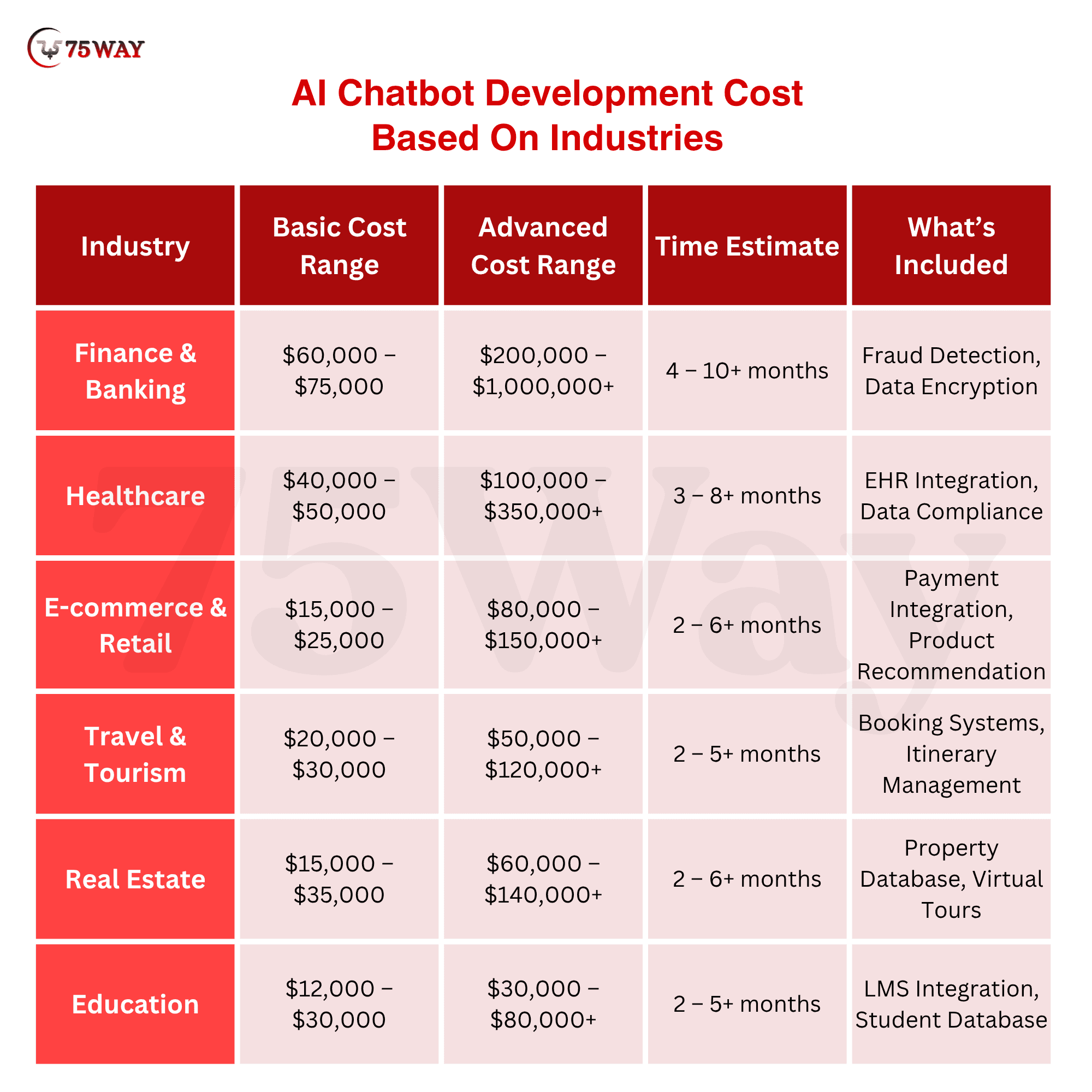 The cost to create an AI chatbot varies across industries depending on complexity, compliance requirements, integration depth, and automation needs. Sectors like healthcare, finance, ecommerce, and SaaS require more advanced systems, while simpler use cases in retail or education may need lower investment levels with basic conversational capabilities.
