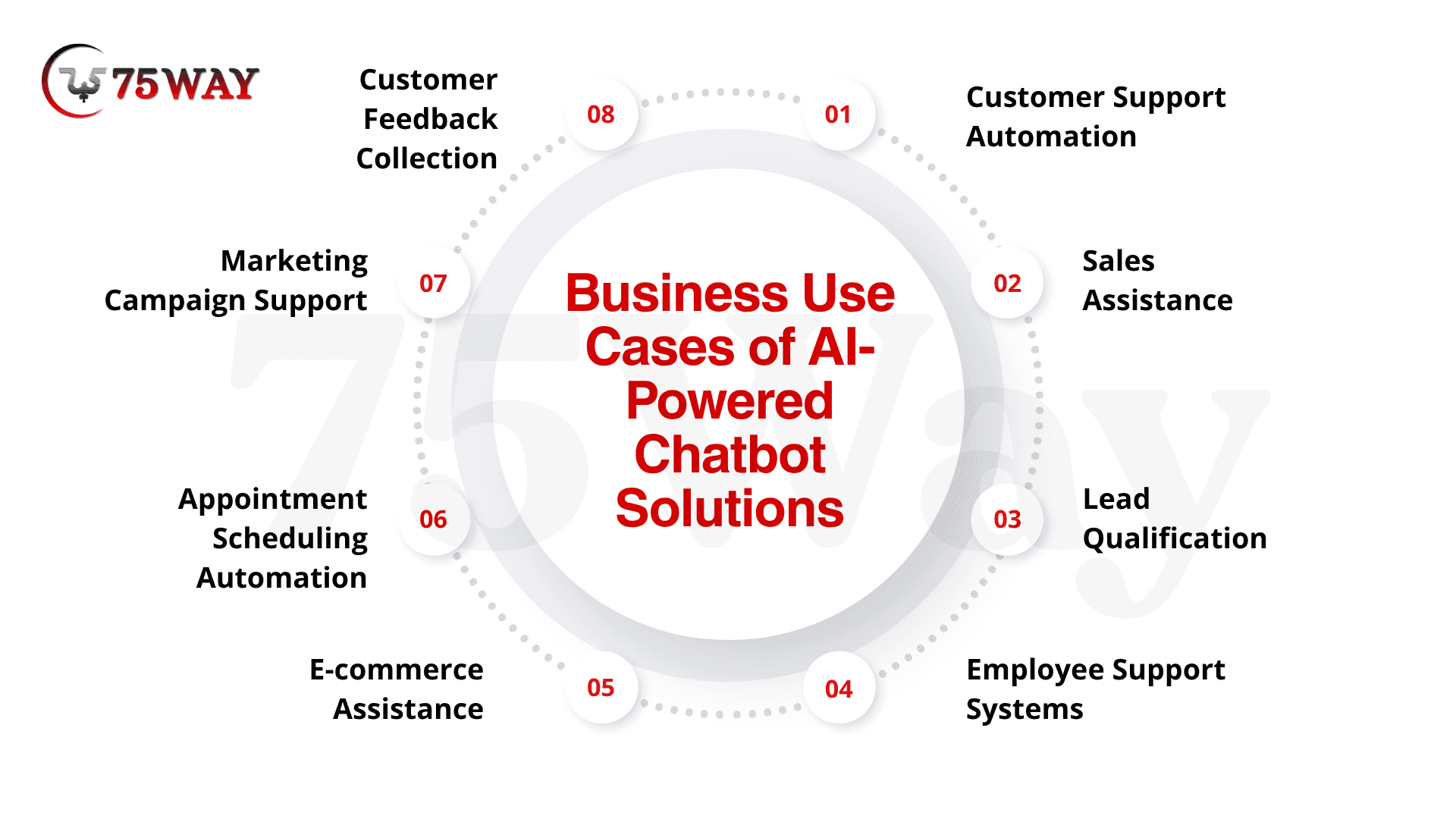 AI chatbots operate across multiple business functions to automate communication, improve efficiency, and enhance user experience. These conversational AI assistants support customer engagement, sales processes, internal operations, and commerce activities through intelligent, real-time interactions that reduce manual effort and improve scalability.