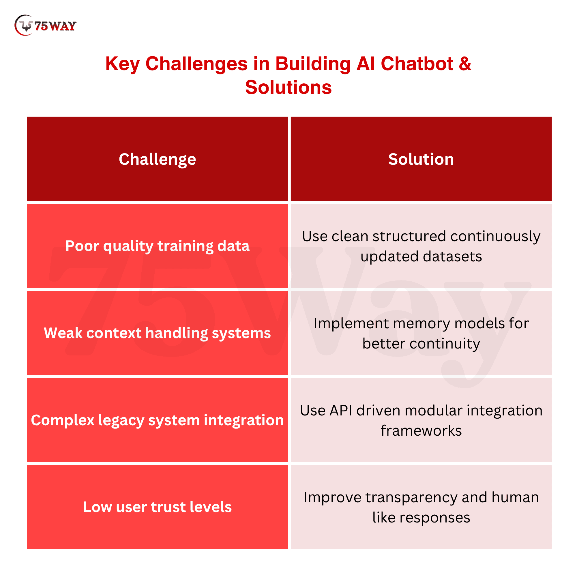 Despite strong advantages, chatbot adoption often faces technical and operational challenges that impact performance and user experience. These issues mainly arise from data quality, system limitations, integration barriers, and user perception, which must be addressed to ensure reliable and scalable implementation.