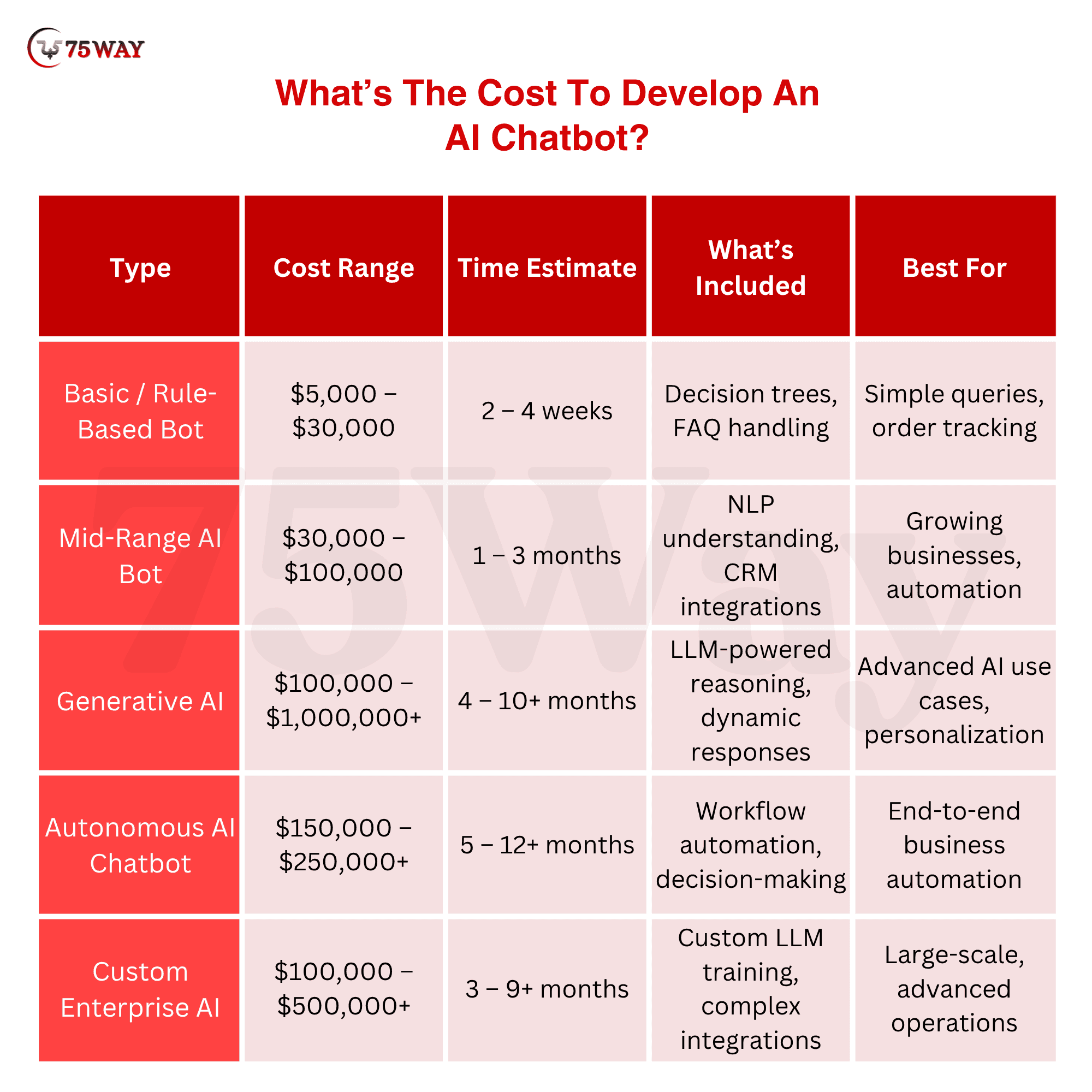 - Autonomous AI Chatbot Cost: $150,000 – $250,000+