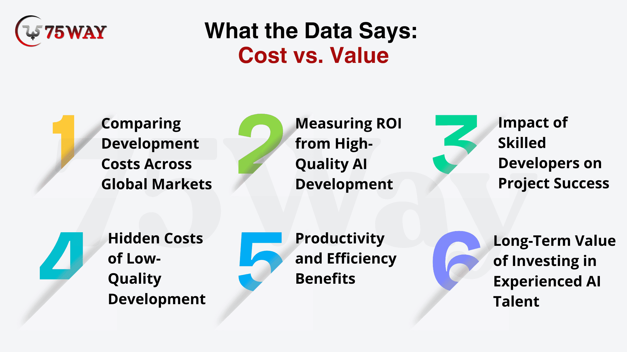 The financial implications of hiring AI talent vary significantly across global markets. While USA-based developers command higher salaries, their ability to deliver efficient, quality-driven solutions can outweigh initial cost differences. This section will explore how various markets compare in terms of development costs and the value yielded from investments.