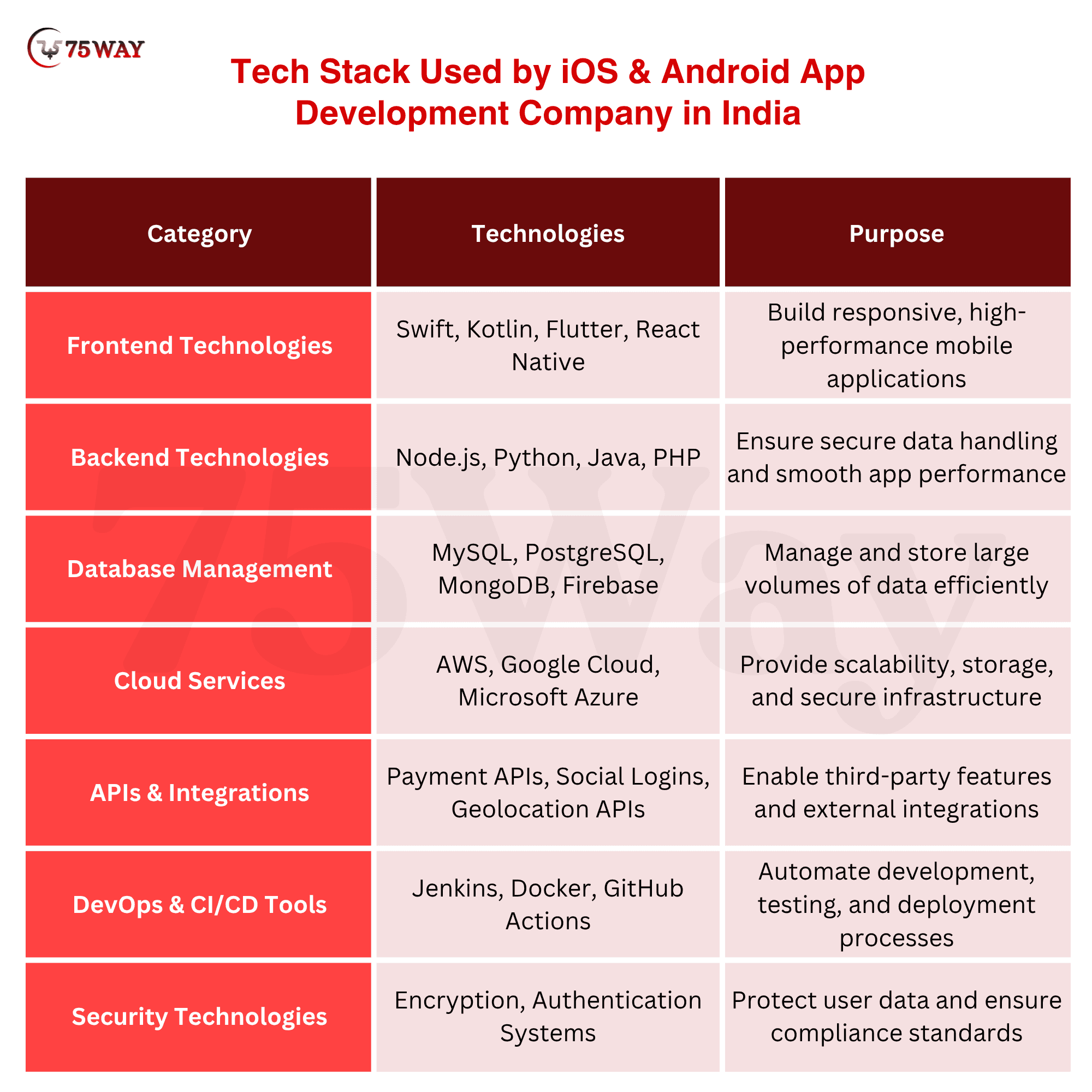 Frontend Technologies: Technologies such as Swift for iOS and Kotlin for Android are widely used to build responsive and high-performance applications. Cross-platform frameworks like Flutter and React Native enable faster development.