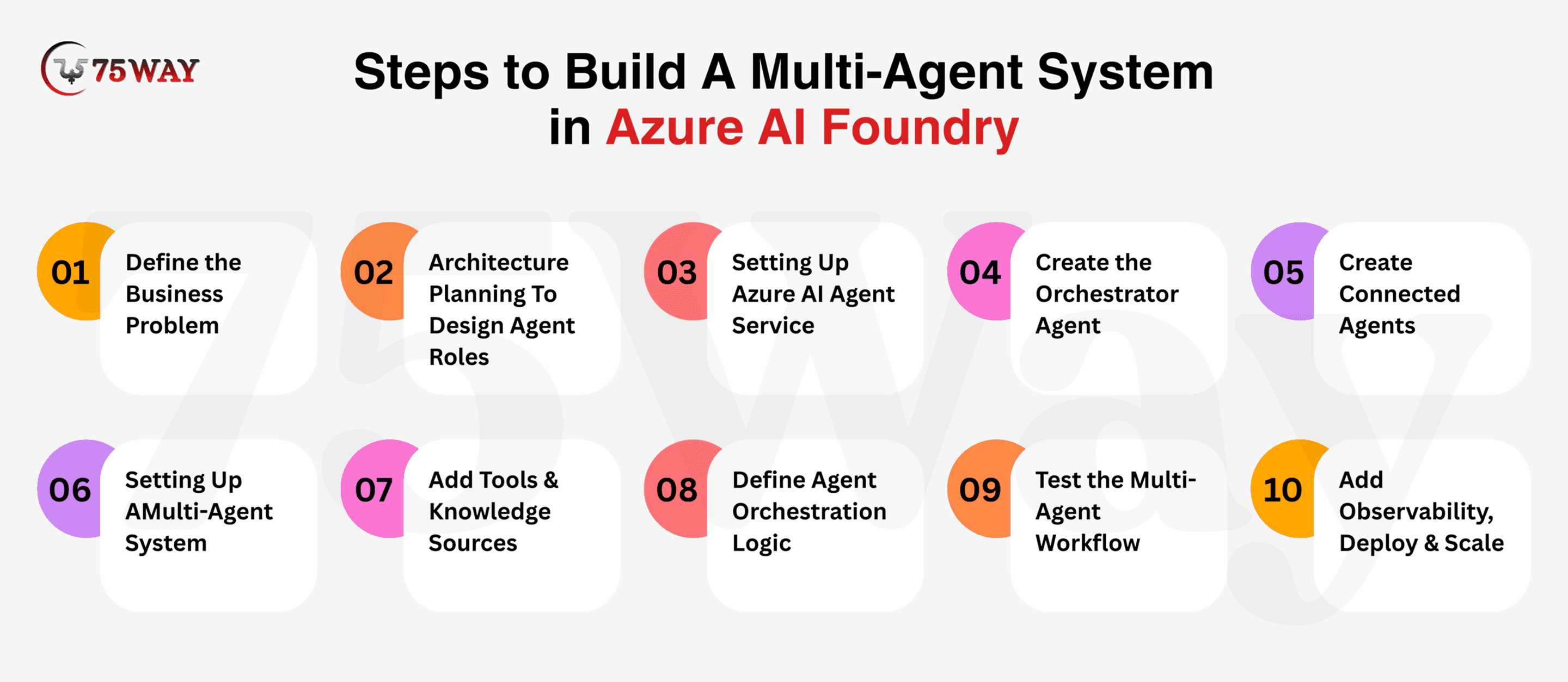 To build a multi-agent system in Azure AI Foundry, you need a structured approach that starts with business requirements and ends with production deployment. The following steps explain how to design agent roles, configure Azure AI Agent Service, enable multimodal capabilities, orchestrate workflows, and scale securely for real-world use.