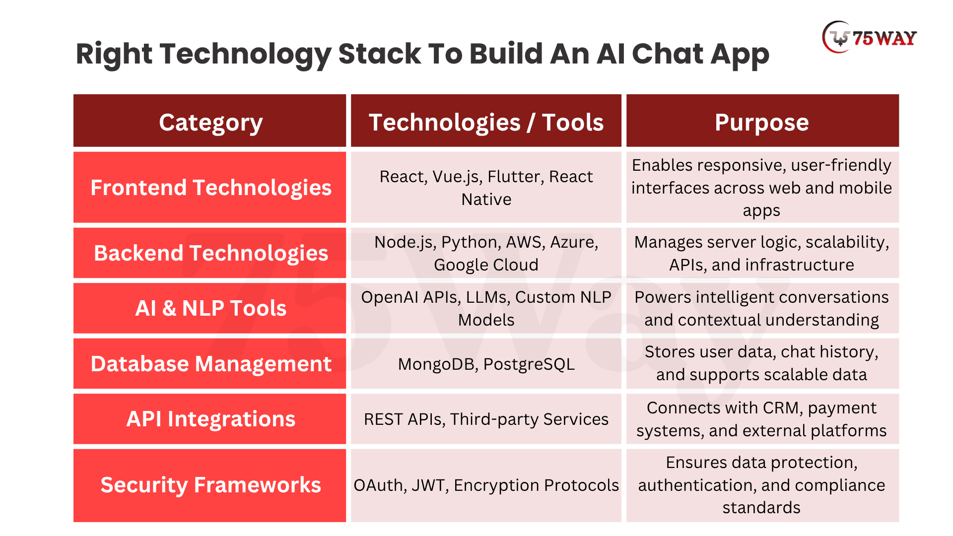 - Security Frameworks: Security technologies protect user data and ensure compliance with global standards. Implementation of authentication systems, encryption protocols, and secure access controls helps build trust, prevent data breaches, and maintain the integrity of your AI chat application.