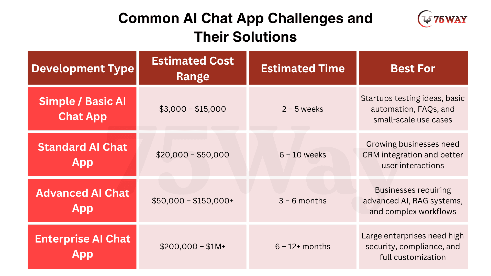 Advanced AI Chat App: An advanced AI chat app incorporates sophisticated capabilities like custom AI models, retrieval-augmented generation, and complex workflows. It is designed for businesses requiring high accuracy, scalability, and tailored solutions. Development usually takes 3 to 6 months, with costs ranging from $50,000 to $150,000 or more, depending on complexity.