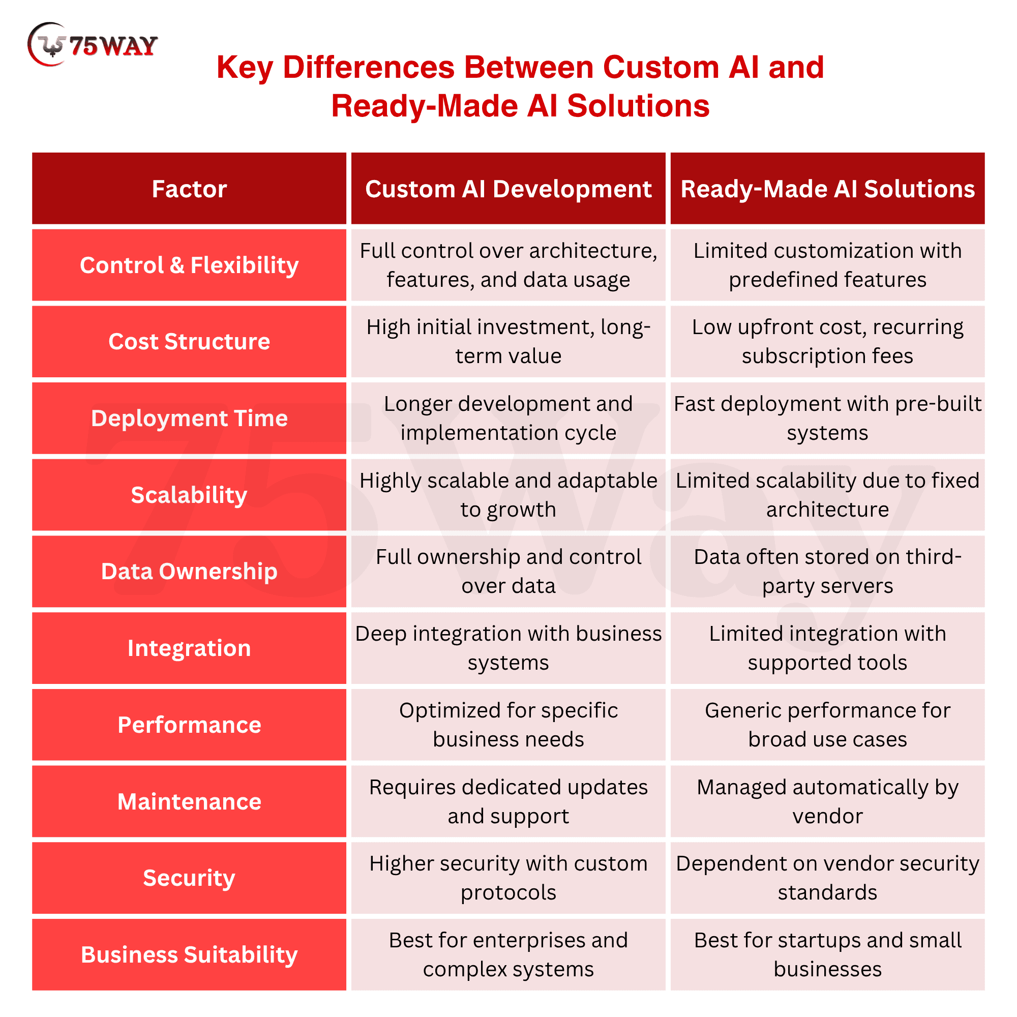 - Ready-made AI solutions provide quick deployment and a lower initial cost advantage