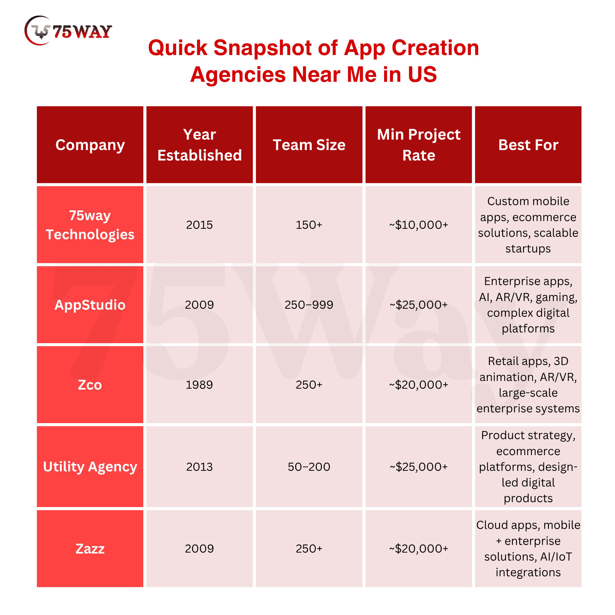 The United States is home to a diverse range of app creation agencies offering end-to-end digital solutions for startups, SMEs, and enterprises. Thus, we have prepared a quick comparison of leading app creation agencies in the United States to simplify your decision-making.