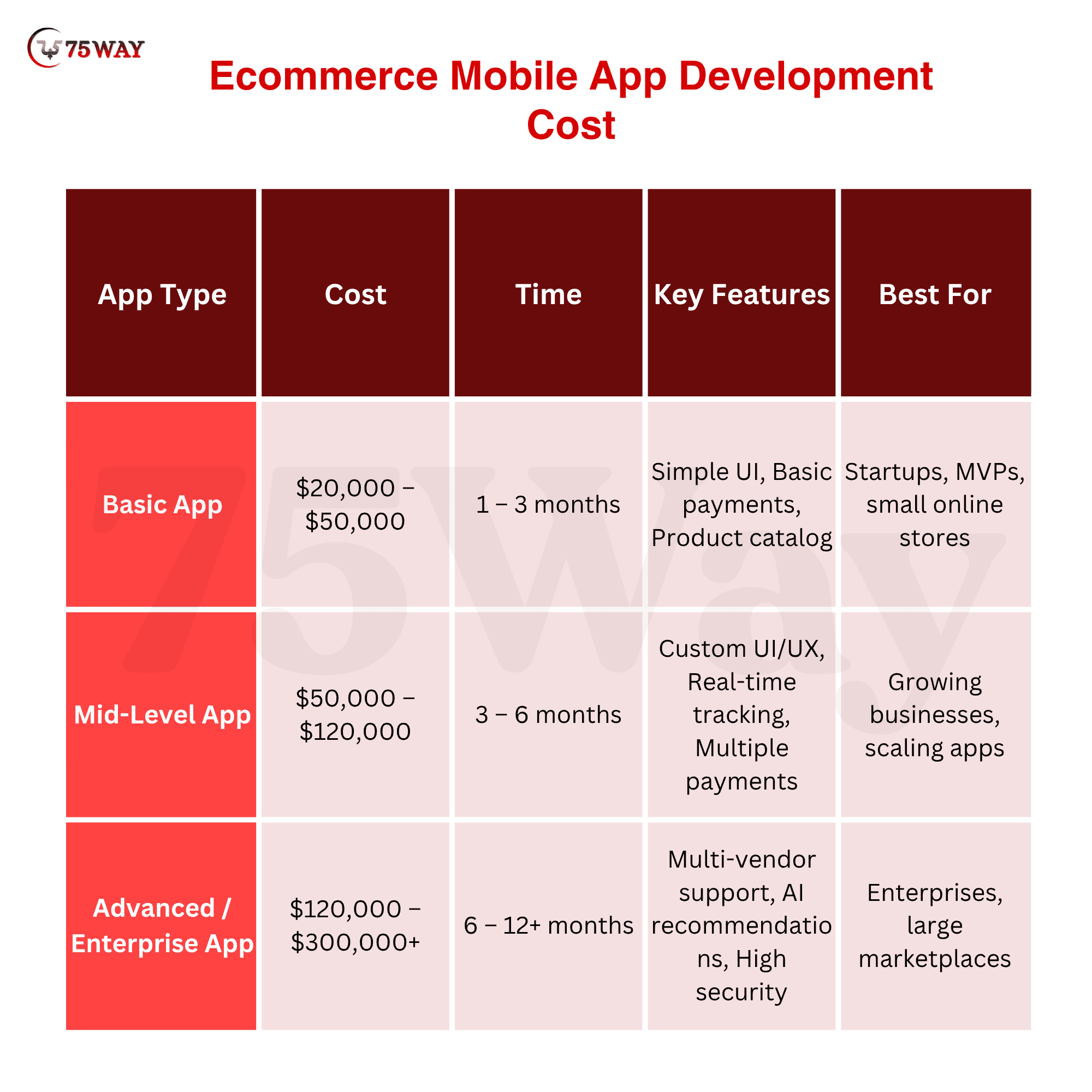 The cost of developing an ecommerce app depends on multiple factors, including app complexity, features, platform choice, and design requirements. On average, a custom ecommerce app development cost ranges between $20,000 and $300,000, covering basic to advanced functionalities.