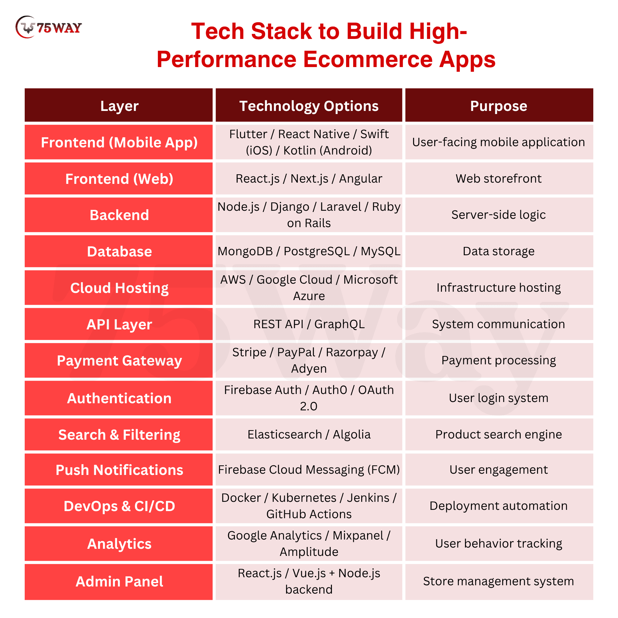 When selecting a technology stack, ecommerce mobile app developers often balance expertise, performance, and development costs. We leverage the following stack for building robust, scalable, and cross-platform ecommerce applications that deliver seamless user experiences.