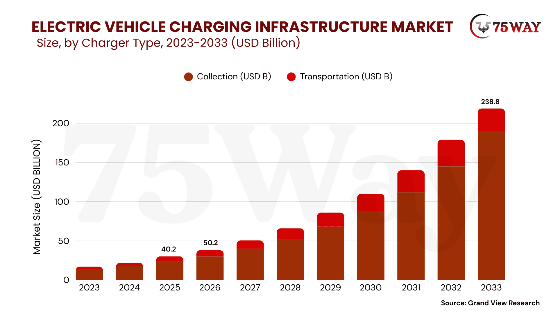 • The global electric vehicle charging infrastructure market is forecasted to reach $238.82 billion by 2033, expanding at a 25.0% CAGR, according to Grand View Research.