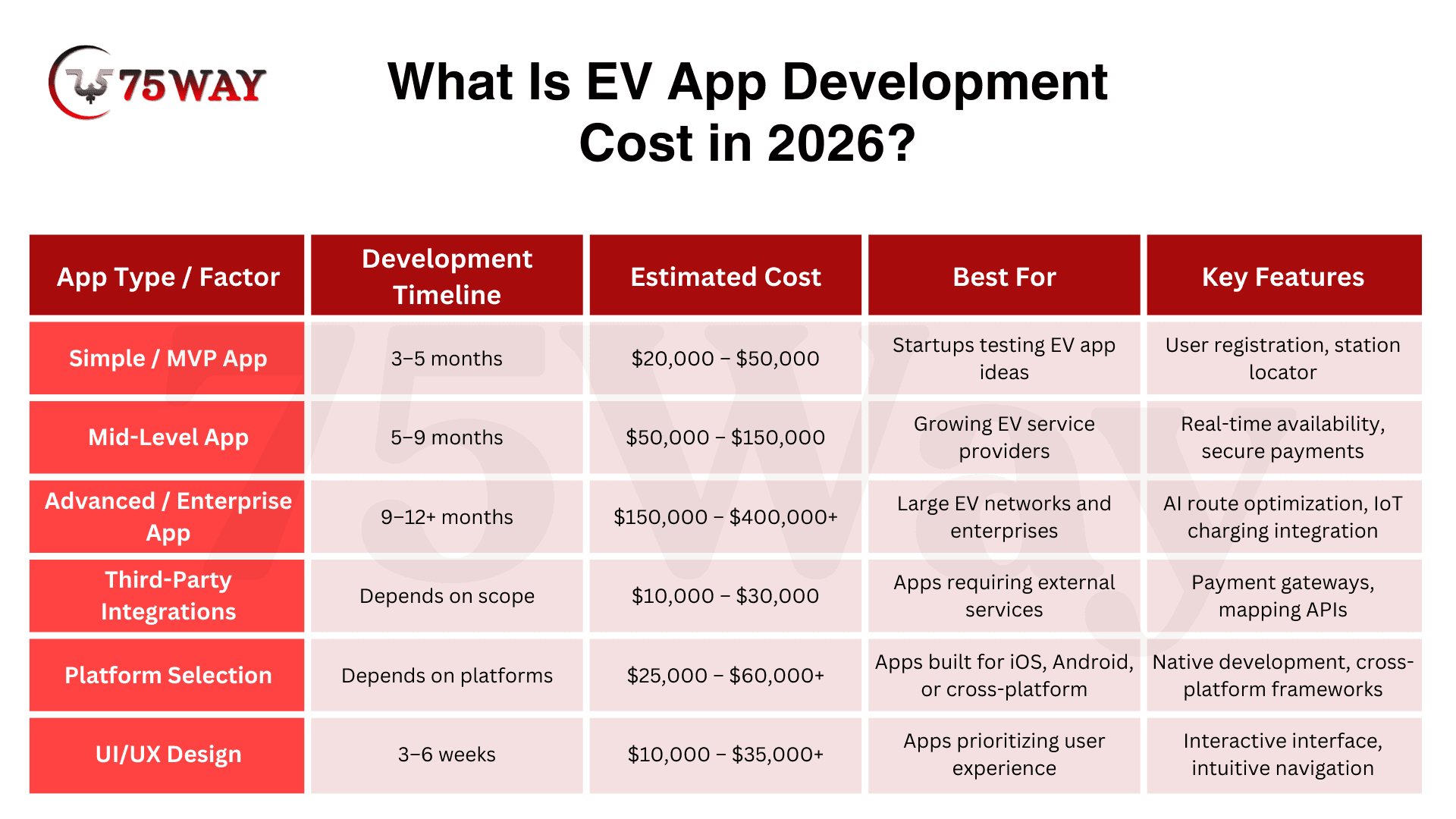 • EV mobile app development costs typically range between $20,000 and $400,000.