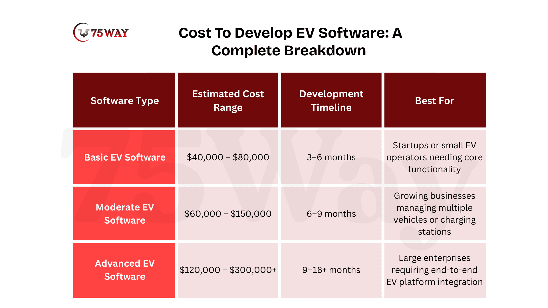- The cost to build basic EV software ranges between $40,000 and $80,000.