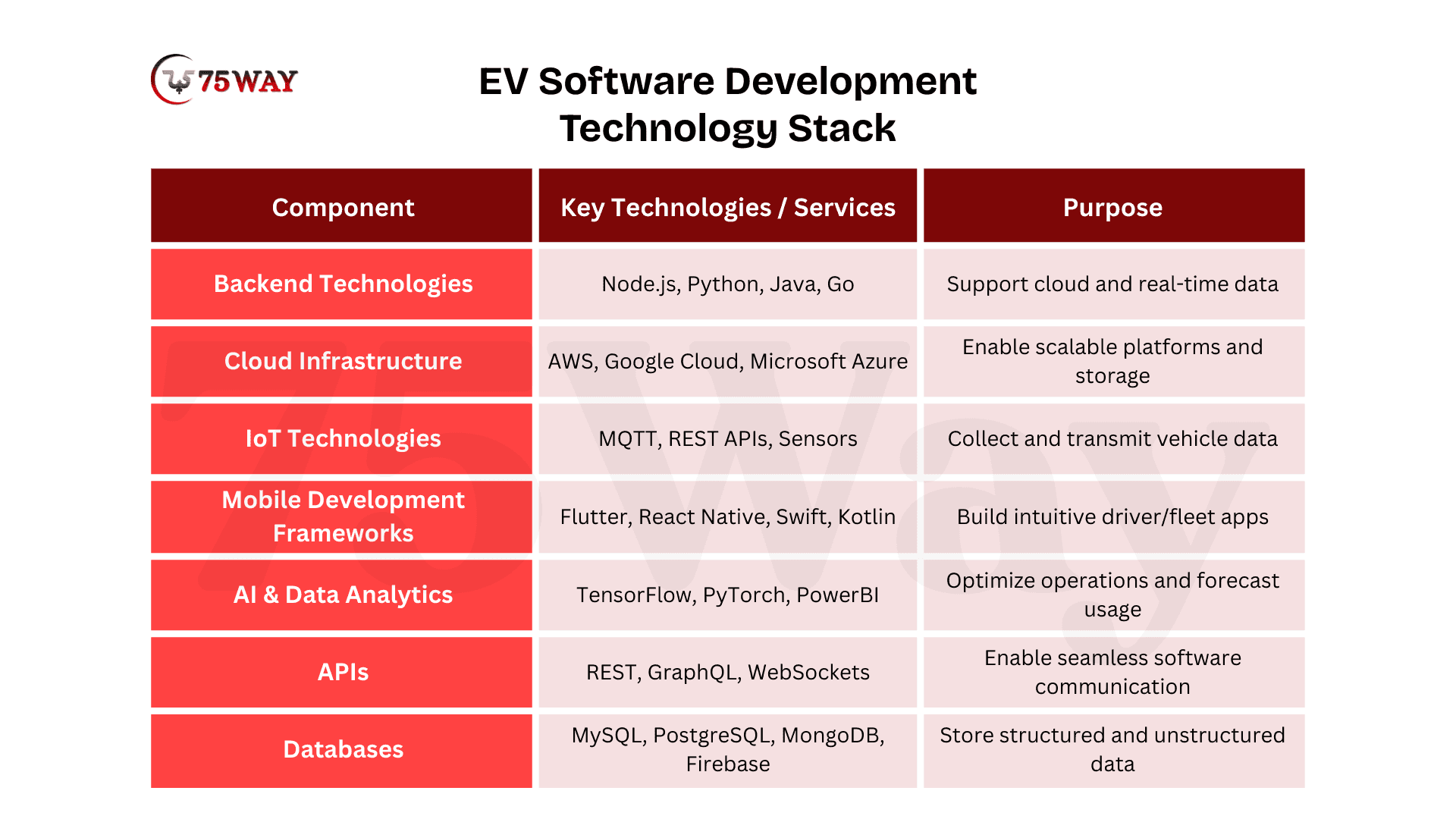 Building scalable and high-performance EV software requires a comprehensive technology ecosystem that connects vehicles, charging infrastructure, and user platforms. From backend frameworks to IoT systems, cloud platforms, and mobile applications, each technology component plays a critical role in enabling real-time monitoring, data processing, predictive insights, and seamless user experiences. Advanced AI and data analytics further enhance battery optimization, fleet management, and energy efficiency for future-ready electric mobility.