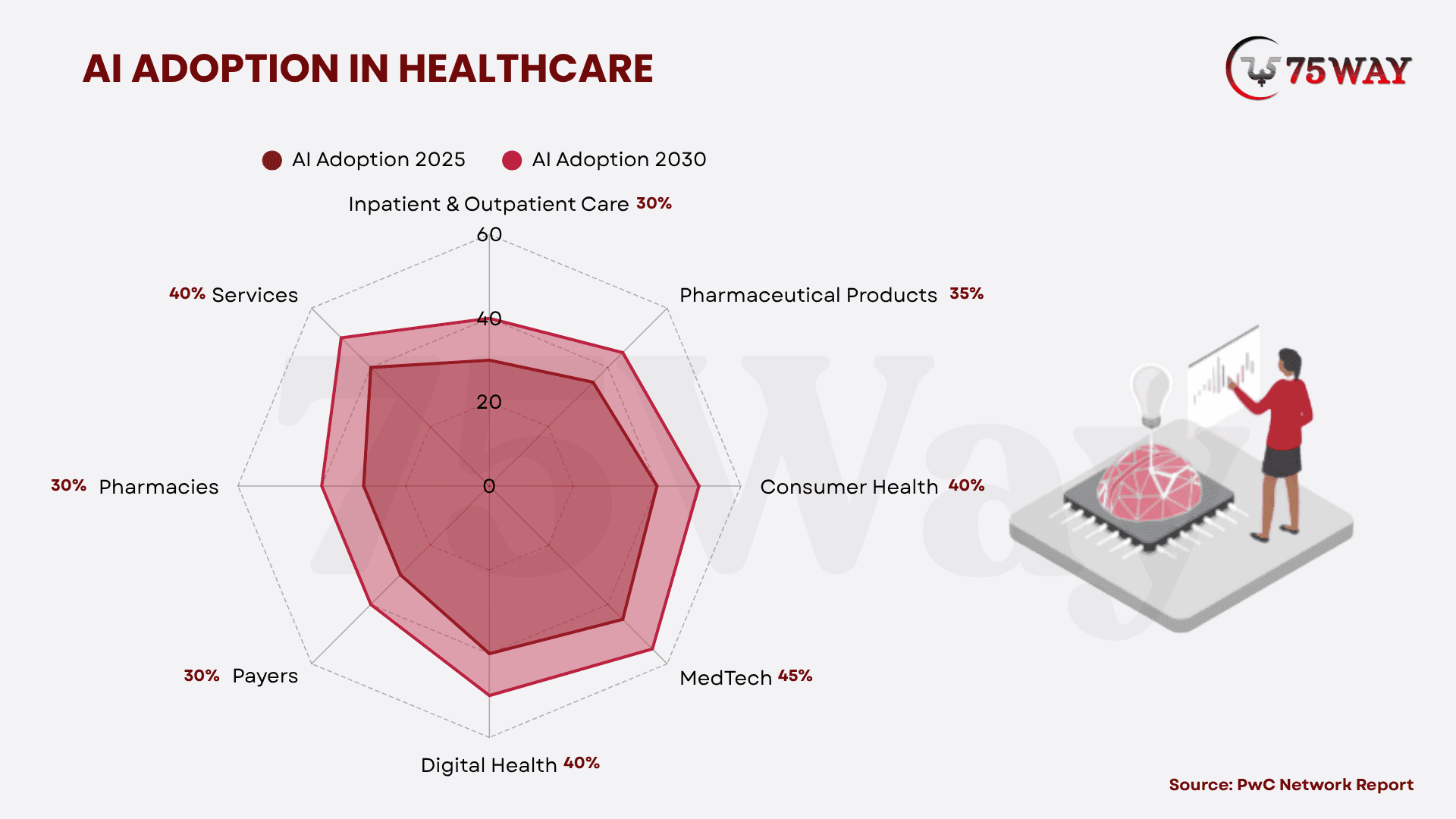 - The AI healthcare market is projected to reach US$868 billion by 2030, including US$646 billion in cost savings and US$222 billion in revenue gains (PwC).