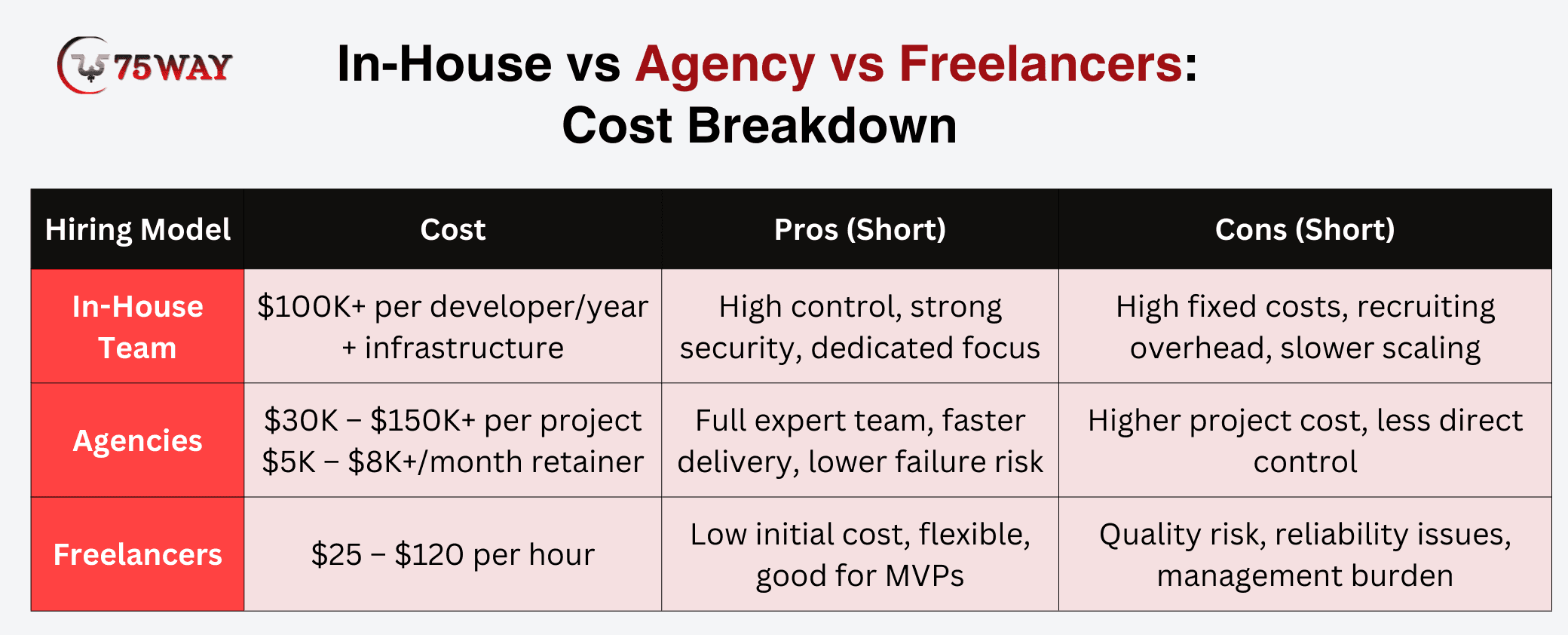 - Project costs can be higher than with freelancers but lower than with in-house teams for complex projects.